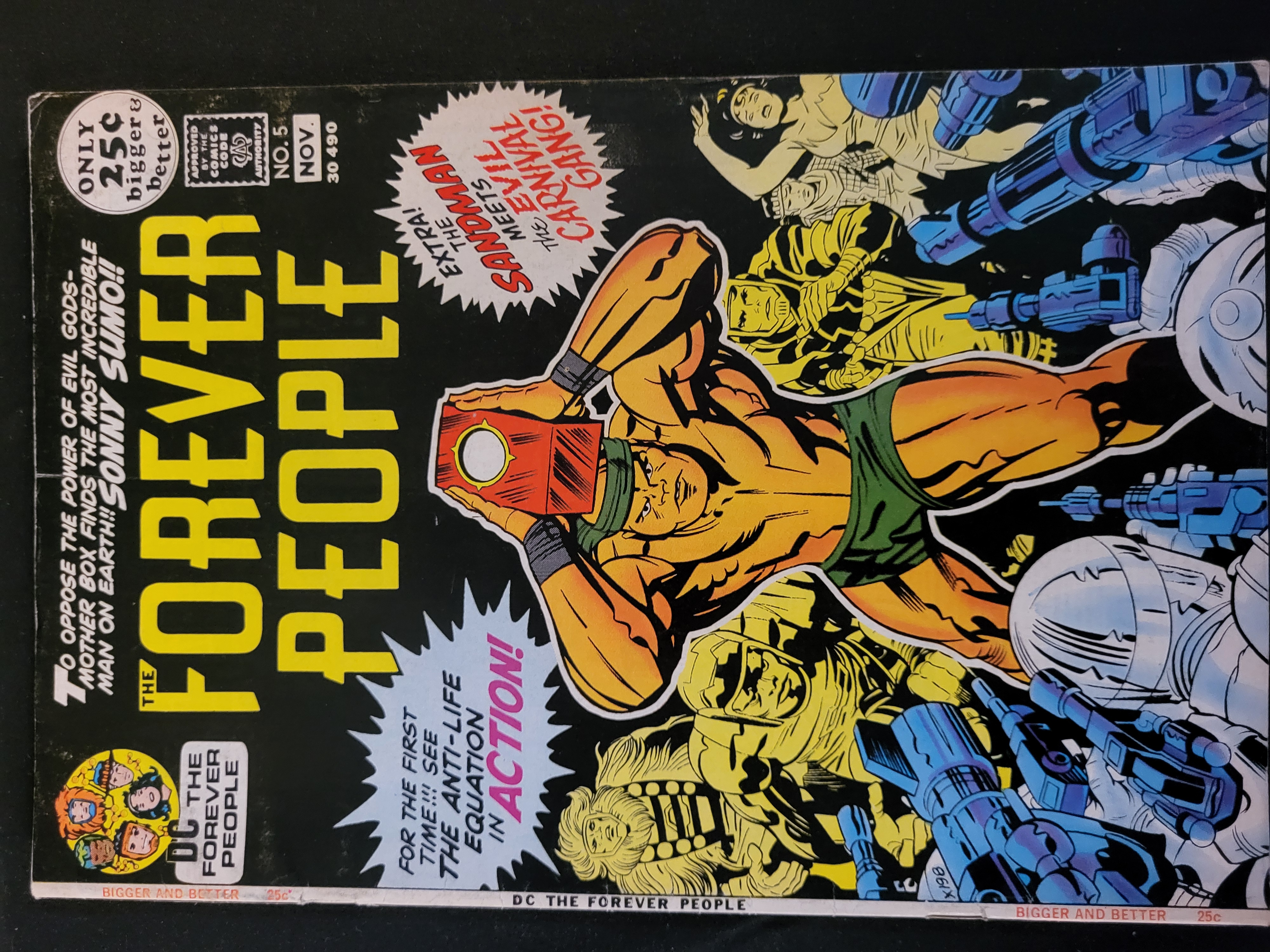 BID PER WHAT YOU SEE IN THE PHOTO, NOT THE AI GENERATED TITLES AND DESCRIPTIONS! This is a copy of The Forever People issue number 5, published by DC Comics in November 1971. The cover art is by Jack Kirby and features the character Sonny Sumo holding a Mother Box. The issue contains the first appearance of Lonar and features the Anti-Life Equation. The cover includes text blurbs referencing the Sandman and the Evil Carnival Gang. The comic displays the Comics Code Authority seal and an original price of 25 cents. This issue is part of Jack Kirby’s Fourth World series.