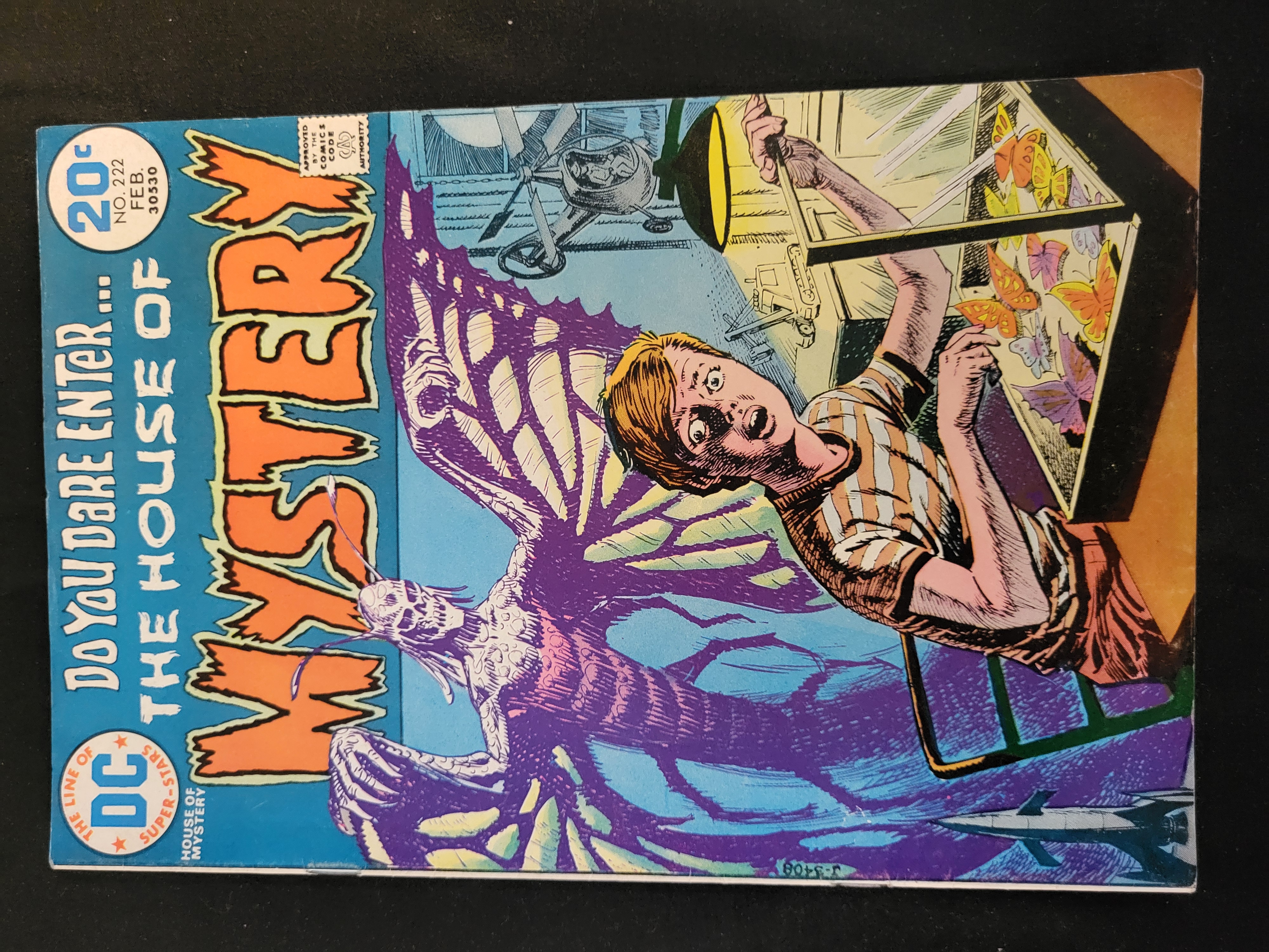 BID PER WHAT YOU SEE IN THE PHOTO, NOT THE AI GENERATED TITLES AND DESCRIPTIONS! A single issue of the Bronze Age comic book House of Mystery, number 222, published by DC Comics with a cover date of February 1974. The cover illustration depicts a startled young man at a butterfly display case being approached by a large, purple-winged skeletal entity. The front cover displays the DC line of Super-Stars logo, a 20-cent price marking, and the Approved by the Comics Code Authority seal. This issue is part of the first series (1951-1983).