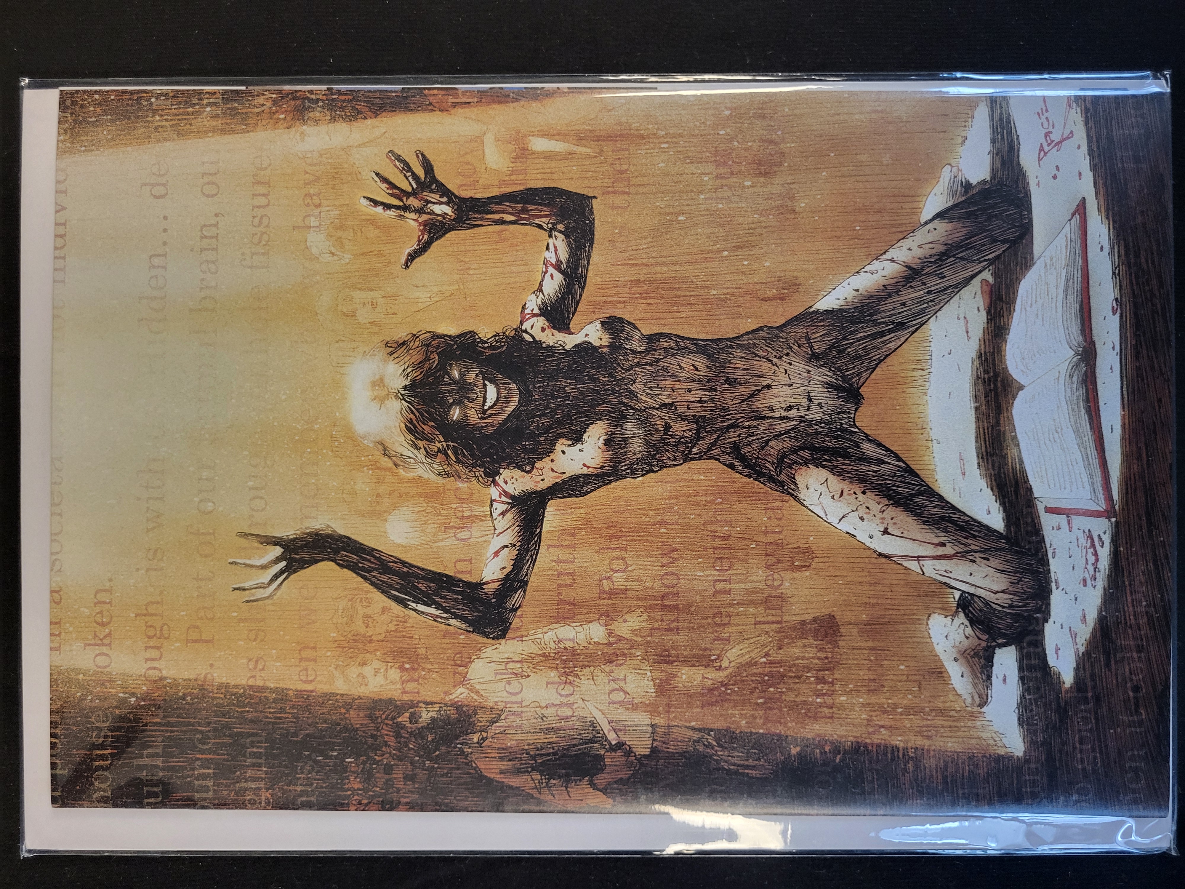 BID PER WHAT YOU SEE IN THE PHOTO, NOT THE AI GENERATED TITLES AND DESCRIPTIONS! This contemporary horror-themed illustration is based on the film Evil Dead Rise and features a central demonic figure with elongated limbs and dark, textured features. The figure is rendered with fine linework and cross-hatching, accented by red-toned spatters. An open book is depicted on the right side of the composition. The background consists of a warm, parchment-like texture with layered English text fragments including house broken and fissure. An artist signature is present in the upper right corner. The item is housed in a clear plastic protective sleeve with a white backing board.