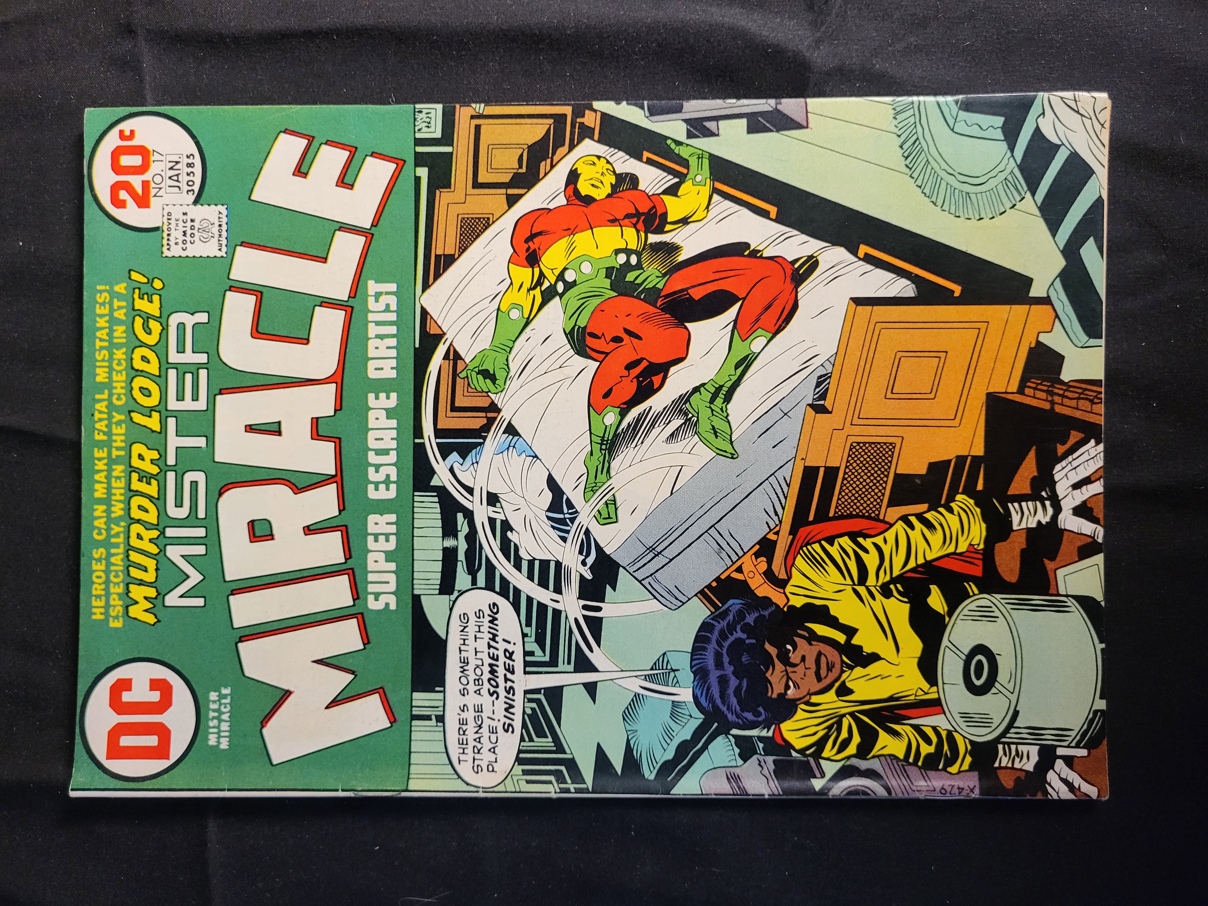 BID PER WHAT YOU SEE IN THE PHOTO, NOT THE AI GENERATED TITLES AND DESCRIPTIONS! This DC Comics publication is Mister Miracle issue number 17, published in January 1973. The cover art, attributed to Jack Kirby, features the character Mister Miracle, identified as the Super Escape Artist, alongside a female character in a scene titled Murder Lodge. The front cover displays a 20-cent price point, the issue number 17, the month of January, and the publisher code 30585. The official Comics Code Authority seal is present in the upper left quadrant. The publication is a standard Bronze Age comic book format printed on paper.