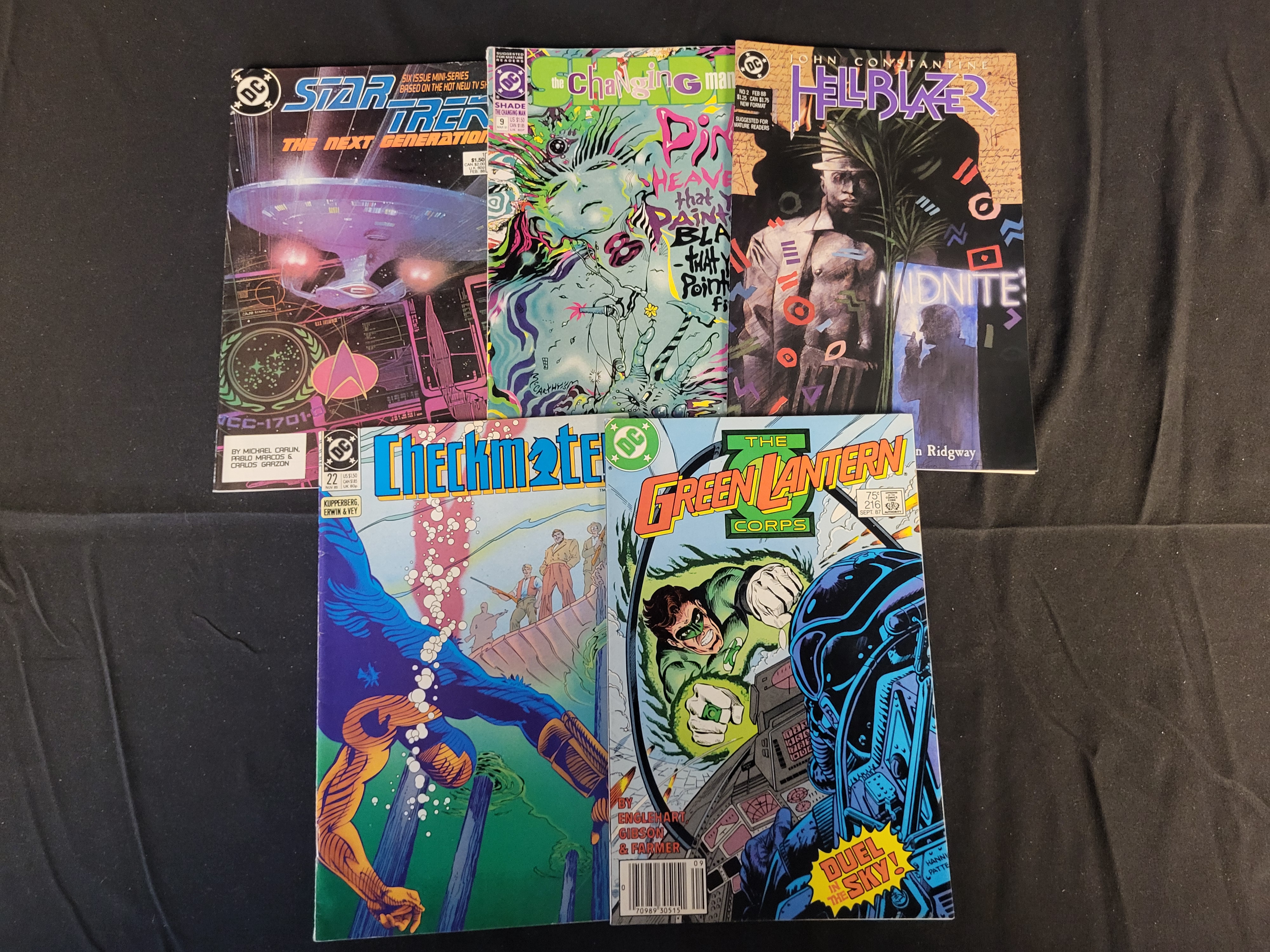 BID PER WHAT YOU SEE IN THE PHOTO, NOT THE AI GENERATED TITLES AND DESCRIPTIONS! A group of vintage DC Comics comic books published between 1987 and 1991. The collection includes The Green Lantern Corps No. 216 (1987), Star Trek: The Next Generation No. 1 (1988), John Constantine, Hellblazer No. 2 (1988), Checkmate! No. 22 (1990), and Shade, the Changing Man No. 9 (1991). Each issue is presented in a standard printed paper format and features original cover art with contemporary pricing information. The Green Lantern Corps No. 216 is noted as a 1987 publication featuring work by Englehart, Gibson, and Farmer. The John Constantine, Hellblazer No. 2 issue features artwork by Ridgway. The collection represents various genres including science fiction, superhero, and supernatural horror from the late Copper Age and early Modern Age of comic books.