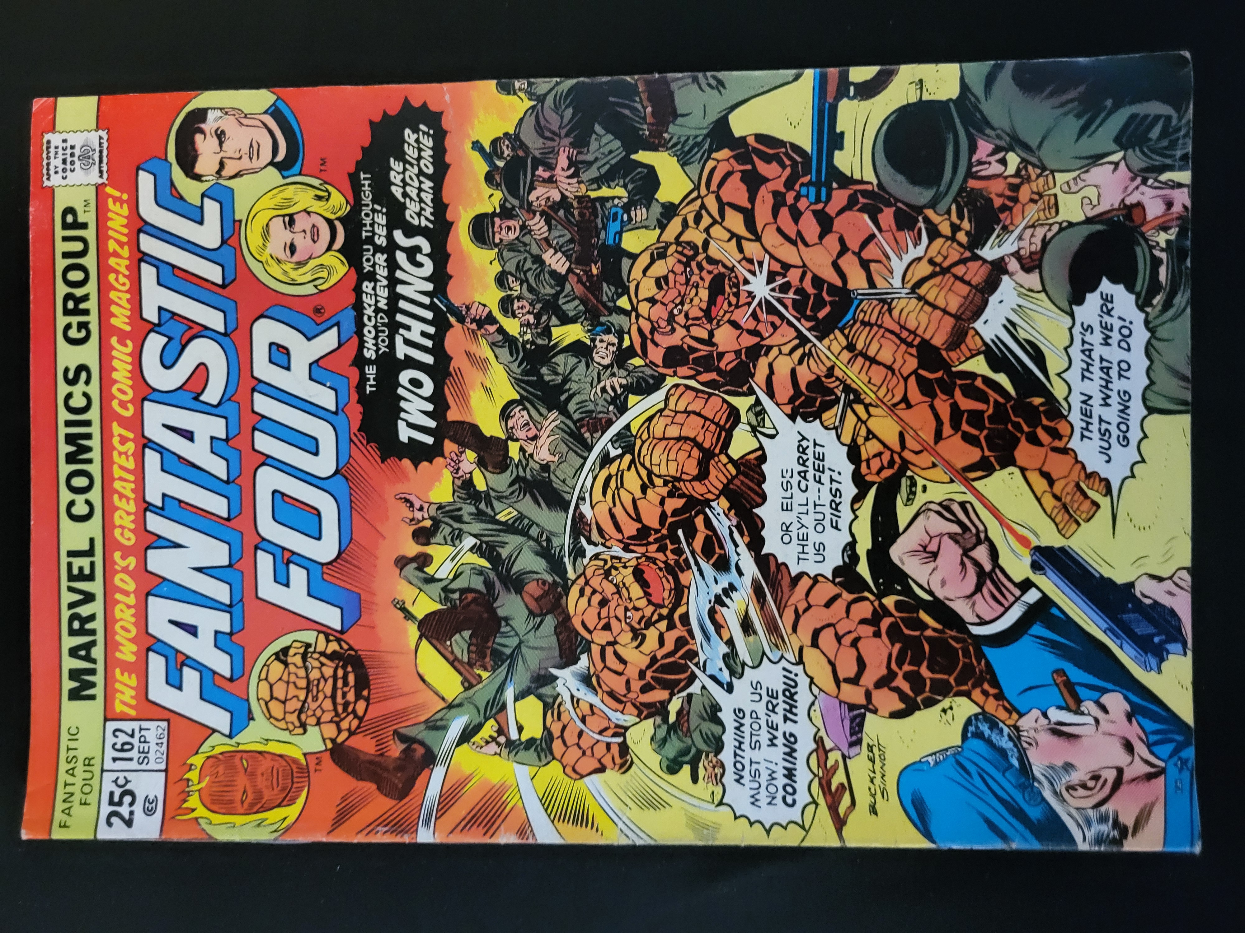 BID PER WHAT YOU SEE IN THE PHOTO, NOT THE AI GENERATED TITLES AND DESCRIPTIONS! Marvel Comics Group Fantastic Four issue number 162, published in September 1975. This Bronze Age comic book features cover art by Rich Buckler and Joe Sinnott. The front cover illustration depicts two versions of the character The Thing engaged in combat against a group of soldiers, accompanied by the tagline Two Things Are Deadlier Than One. The cover includes the Marvel Comics Group masthead, a 25-cent price point, and the Comics Code Authority seal. The item is a standard format comic book printed on newsprint with a glossy paper cover.