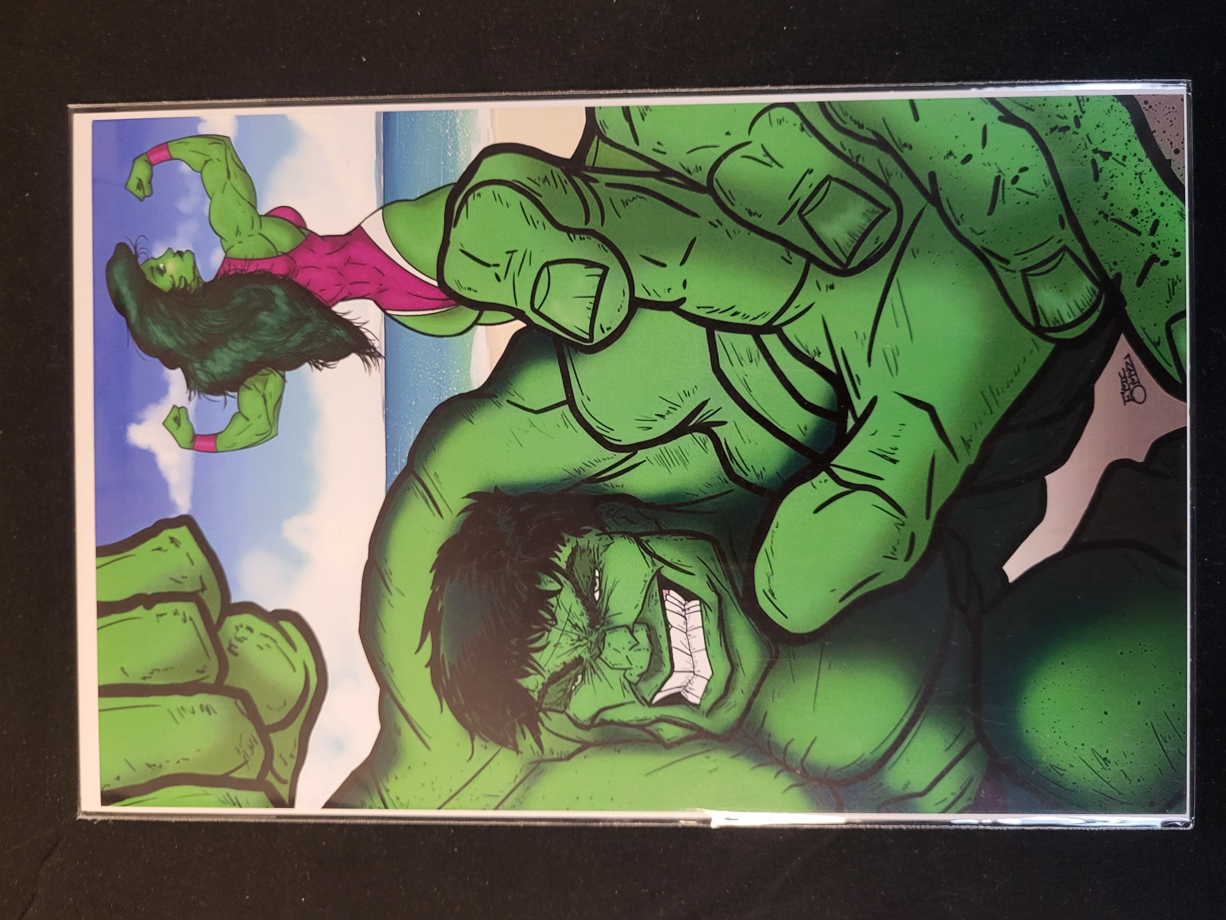 BID PER WHAT YOU SEE IN THE PHOTO, NOT THE AI GENERATED TITLES AND DESCRIPTIONS! Hulk #11 David Nakayama Exclusive Virgin Variant comic book, published by Marvel Comics in 2023. This edition features a virgin cover, which is devoid of the standard title masthead, issue numbering, and barcode. The illustration depicts She-Hulk in a flexing pose against a beach background, framed by the oversized hands and face of the Hulk. This release is identified as a Color Bleed variant, exclusive to Unknown Comics and 616 Comics. The artwork includes an artist signature on the right side. The comic is printed on paper and is presented in a clear protective sleeve with a white cardboard backing.