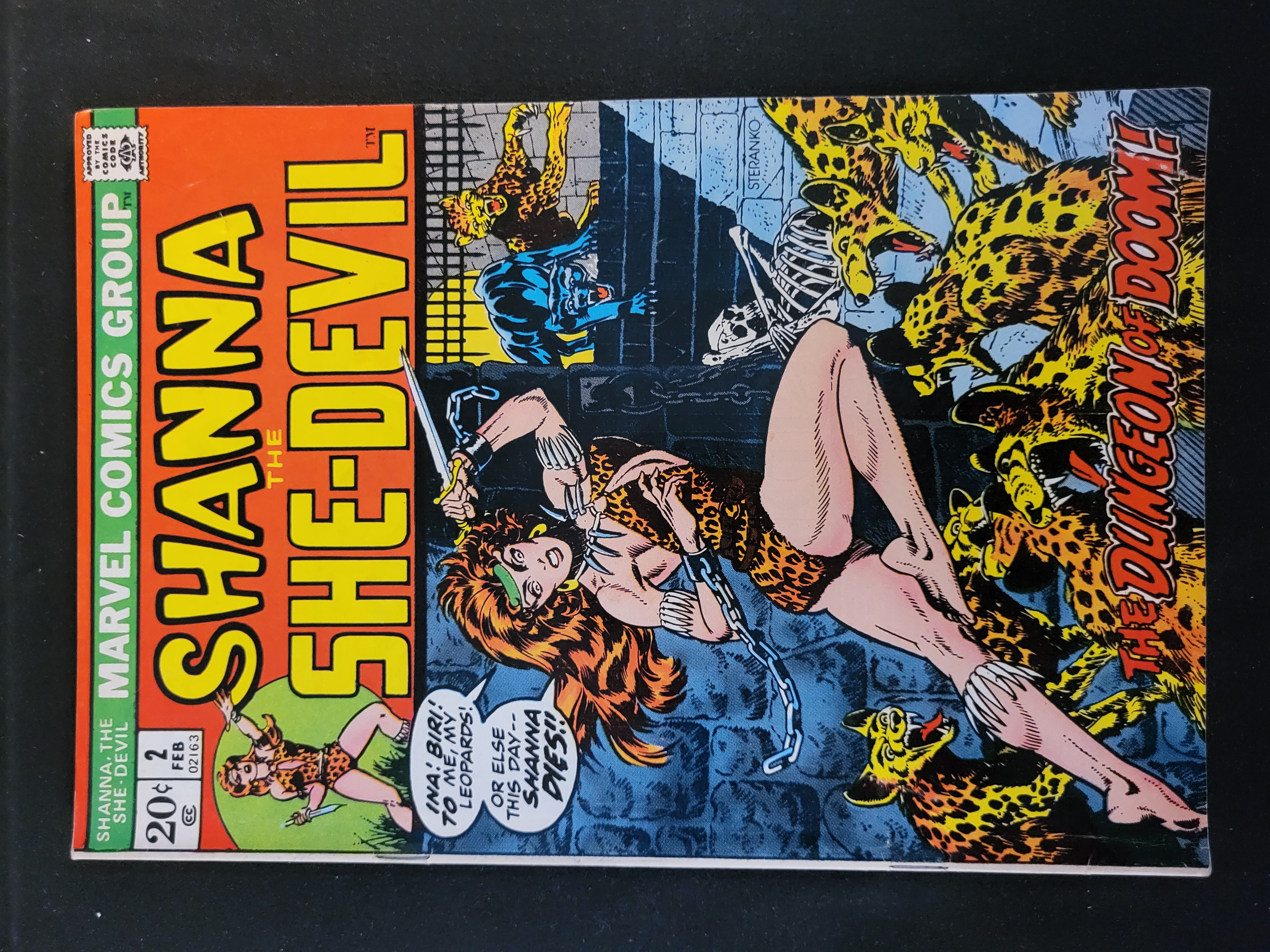 BID PER WHAT YOU SEE IN THE PHOTO, NOT THE AI GENERATED TITLES AND DESCRIPTIONS! A copy of Shanna the She-Devil issue number 2, published by the Marvel Comics Group in February 1973. This Bronze Age comic book features the second appearance of the character Shanna. The cover art is by Jim Steranko and depicts Shanna in a leopard-print costume wielding a knife against a pack of leopards in a dungeon setting, titled The Dungeon of Doom! The cover includes a 20-cent price point, the Comics Code Authority seal, and a dialogue bubble reading Ina! Biri! To me, my leopards! Or else this day– Shanna dies!! Interior art is attributed to Ross Andru. The publication is printed on paper with a saddle-stitched binding.