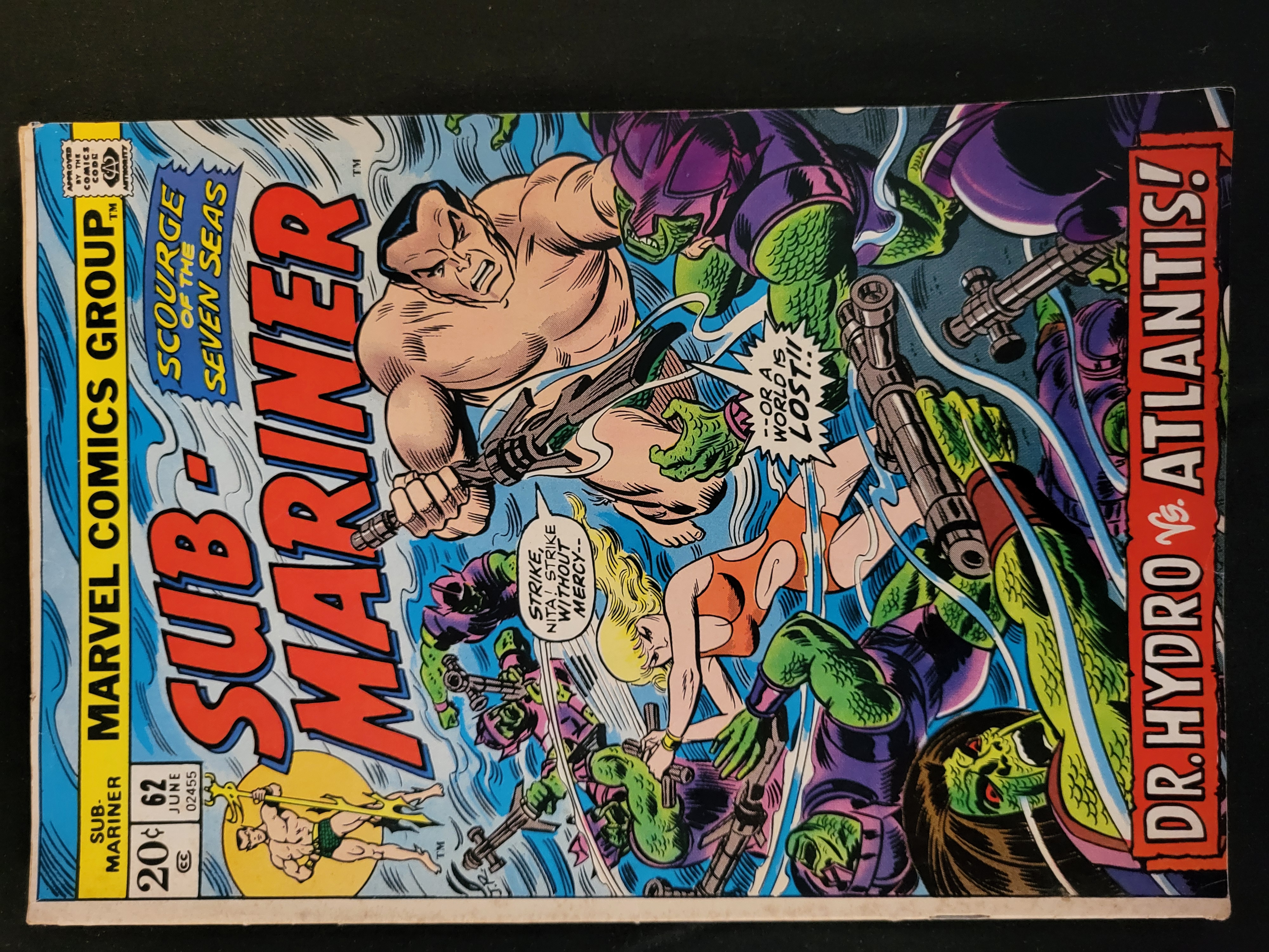 BID PER WHAT YOU SEE IN THE PHOTO, NOT THE AI GENERATED TITLES AND DESCRIPTIONS! This is a single comic book issue, Sub-Mariner #62, published by Marvel Comics Group with a cover date of June 1973. The cover art, titled Dr. Hydro vs. Atlantis!, depicts Namor the Sub-Mariner and Namorita in an underwater battle against green-skinned antagonists. The issue features a 20-cent cover price and the Comics Code Authority seal of approval. Visible text includes Scourge of the Seven Seas and action-oriented speech bubbles. This issue is noted in market documentation for featuring the death of Doctor Hydro.
