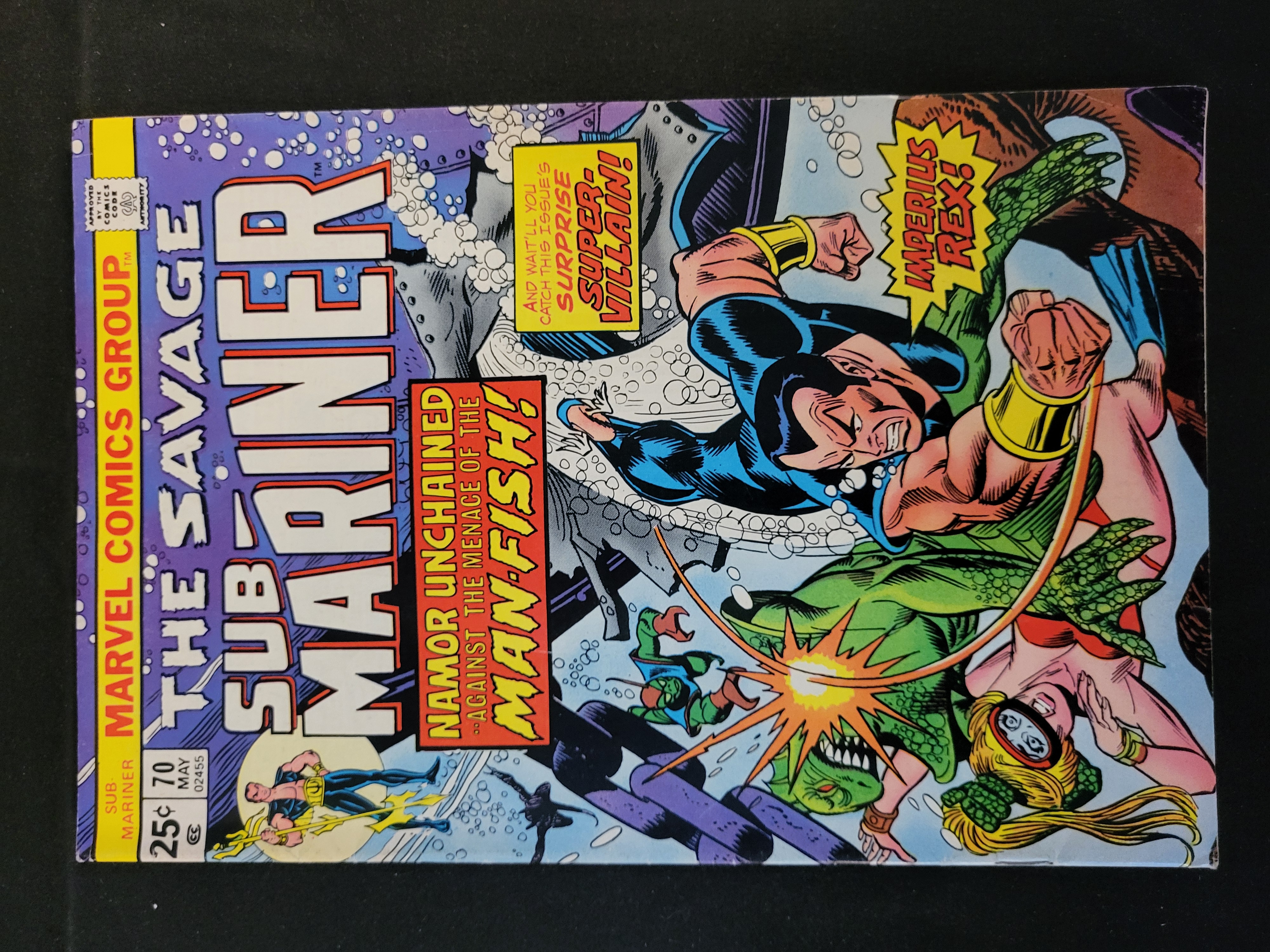 BID PER WHAT YOU SEE IN THE PHOTO, NOT THE AI GENERATED TITLES AND DESCRIPTIONS! A single-issue comic book titled The Savage Sub-Mariner issue number 70, published by Marvel Comics Group in May 1974. The cover features dynamic action art depicting Namor the Sub-Mariner in combat with the Man-Fish, accompanied by text bubbles reading IMPERIUS REX! and NAMOR UNCHAINED… AGAINST THE MENACE OF THE MAN-FISH!. Notable markings include a 25-cent price point, the Approved by the Comics Code Authority seal, and the issue number 02455. Market consensus identifies this issue as featuring the first appearance of the character Piranha. The comic is printed on standard paper stock with a color-printed cover.