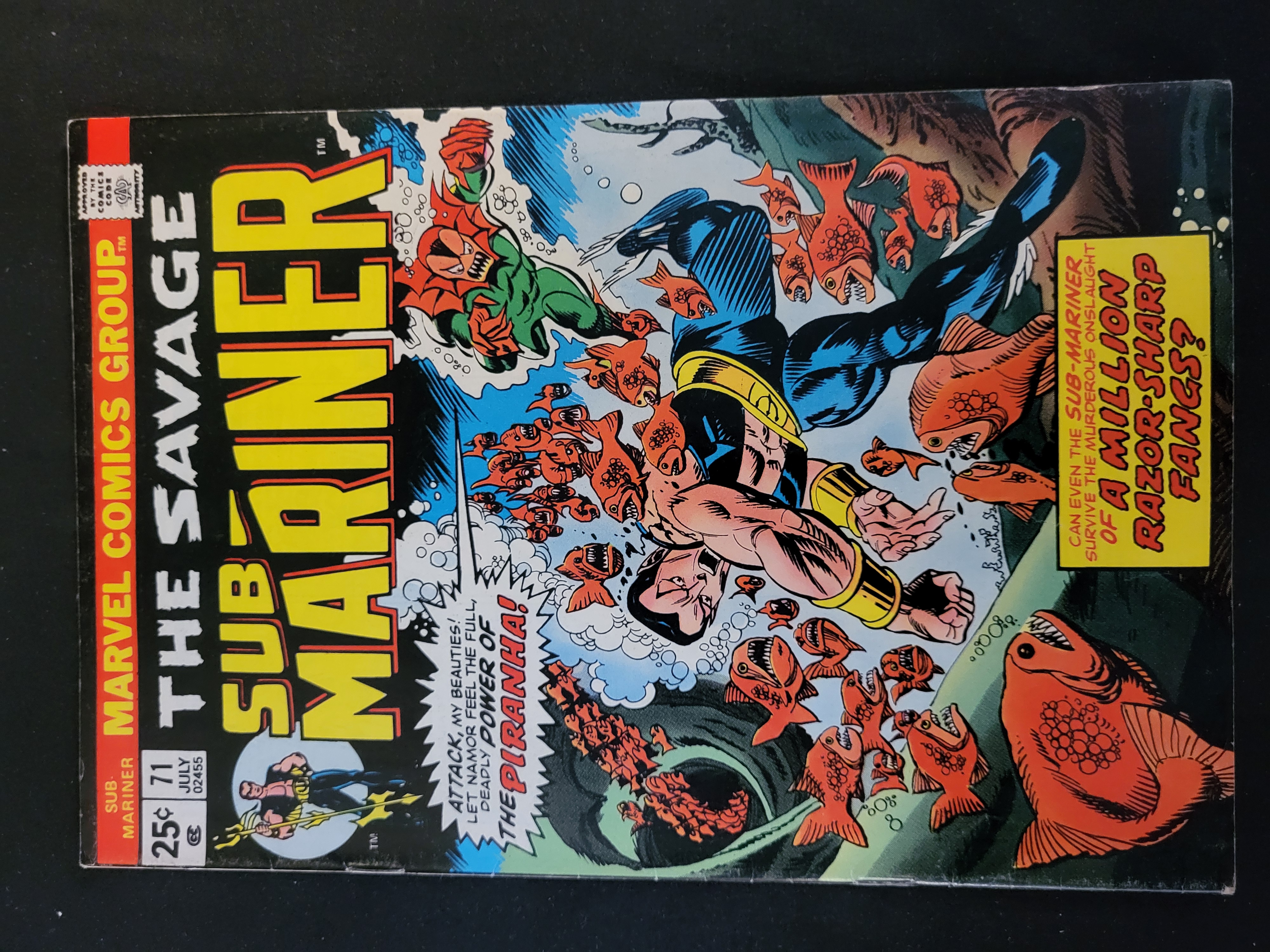 BID PER WHAT YOU SEE IN THE PHOTO, NOT THE AI GENERATED TITLES AND DESCRIPTIONS! This comic book is an original copy of The Savage Sub-Mariner issue number 71, published by the Marvel Comics Group with a cover date of July 1974. The cover features an illustration of Prince Namor the Sub-Mariner in combat with a swarm of predatory fish, with the villain Piranha appearing in the background. The front cover displays the title in yellow and red lettering, a 25-cent price point, and the Comics Code Authority seal. This issue is part of the Bronze Age of comic books and features the first appearance of the Piranha.