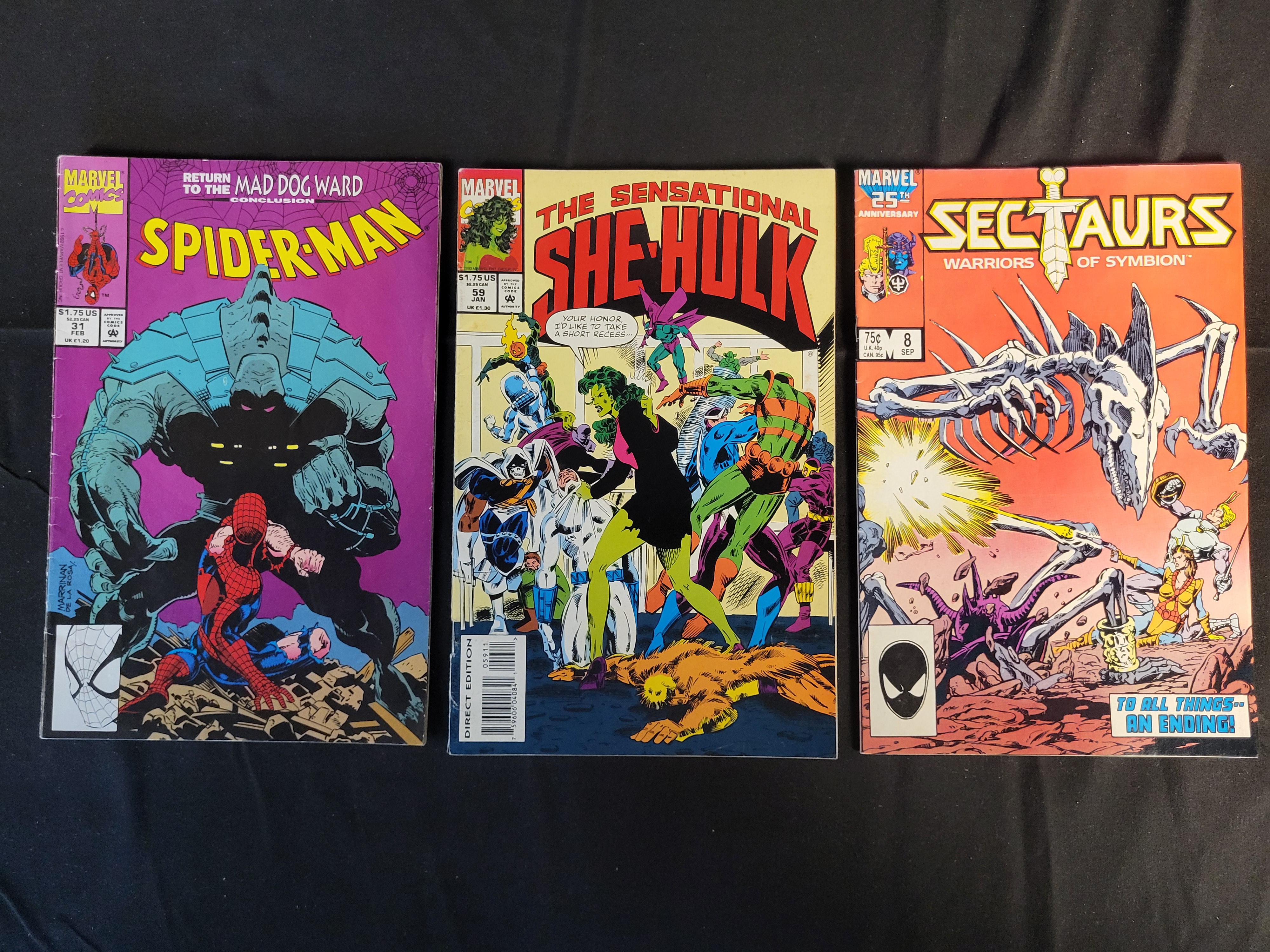 BID PER WHAT YOU SEE IN THE PHOTO, NOT THE AI GENERATED TITLES AND DESCRIPTIONS! A trio of vintage Marvel comic books published between 1986 and 1994. The collection includes Spider-Man #31 (February 1993) featuring the conclusion of the Return to the Mad Dog Ward storyline, The Sensational She-Hulk #59 (January 1994), and Sectaurs: Warriors of Symbion #8 (September 1986), which is a Marvel 25th Anniversary issue. Each comic features color cover art with original cover prices ranging from $0.75 to $1.75. The Spider-Man and She-Hulk issues are identified as Direct Editions. The Sectaurs issue features the 25th Anniversary border design.