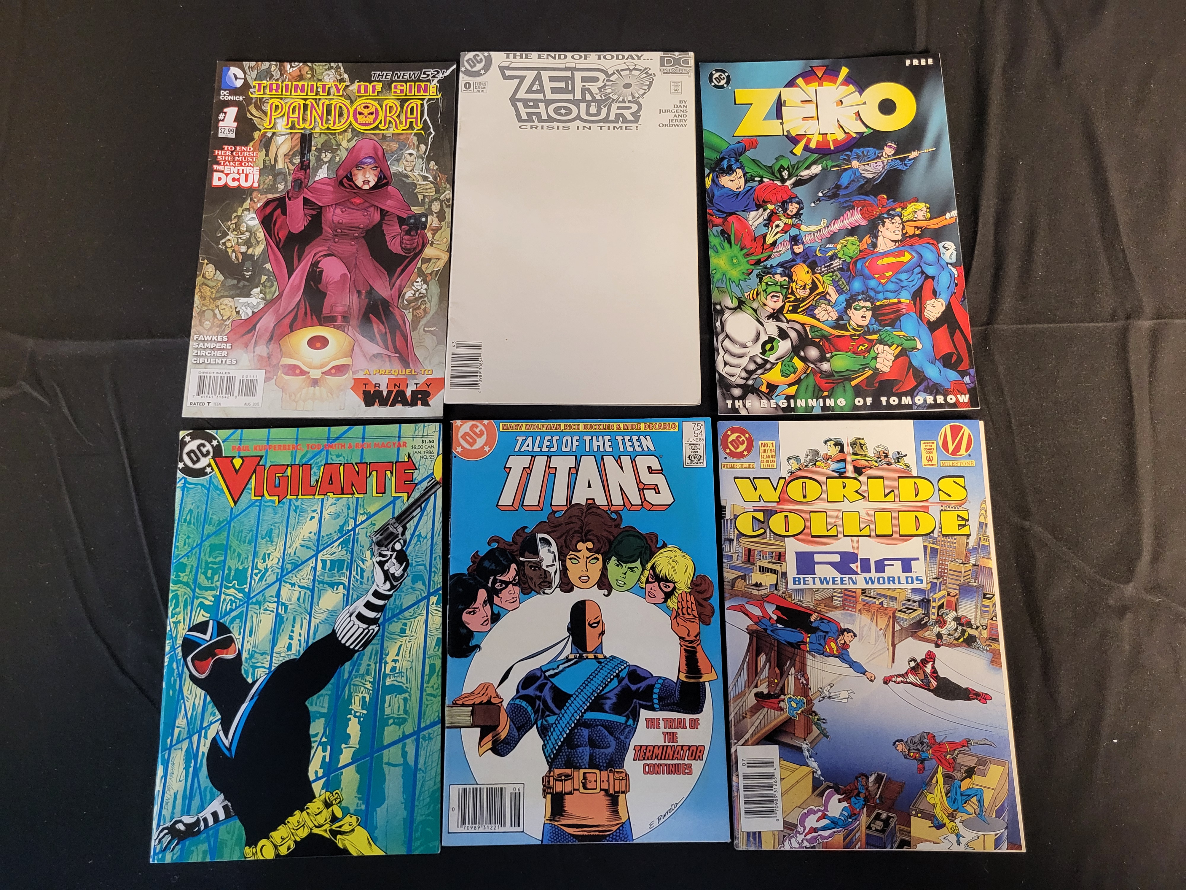 BID PER WHAT YOU SEE IN THE PHOTO, NOT THE AI GENERATED TITLES AND DESCRIPTIONS! A collection of DC comic books from the Modern Age, featuring various titles and series spanning from the mid-1980s to the early 2010s. The group includes Tales of the Teen Titans #54 (June 1985) written by Marv Wolfman, featuring Deathstroke. Also included are Trinity of Sin: Pandora #1 (The New 52), two different cover variants of Zero Hour: Crisis in Time! #0, Vigilante #25 dated January 1986, and the Worlds Collide: Rift Between Worlds #1 DC and Milestone crossover from July 1994. The comics are printed on standard glossy and matte paper stock, featuring cover art by various artists of the period including Dan Jurgens and Jerry Ordway.