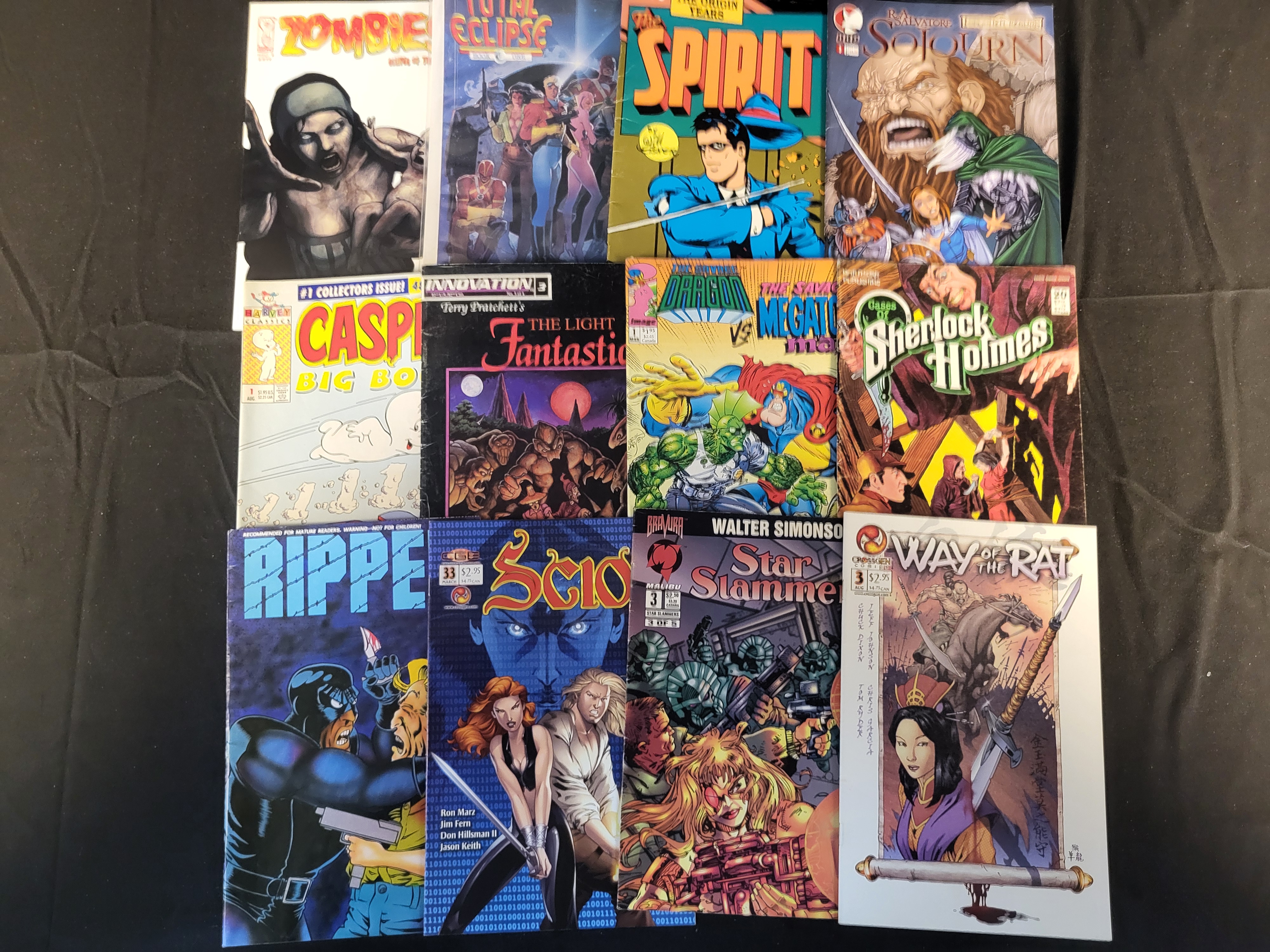 BID PER WHAT YOU SEE IN THE PHOTO, NOT THE AI GENERATED TITLES AND DESCRIPTIONS! This assortment of comic books features a diverse range of genres including fantasy, superhero, horror, and classic animation. The collection includes titles from various independent and established imprints such as Image, CrossGen, Malibu, Innovation, and Harvey Classics. Notable issues visible include Harvey Classics Casper Big Book number 1 Collector’s Issue, The Spirit: The Origin Years, The Savage Dragon vs. Megaton Man, Terry Pratchett’s The Light Fantastic, and Cases of Sherlock Holmes. Also present are issues of Scion, Way of the Rat, Ripper, Star Slammers, Sojourn, Total Eclipse, and Zombie. The items represent publication dates from the late 20th to early 21st century. The comics are constructed of printed paper with standard staple-bound spines.