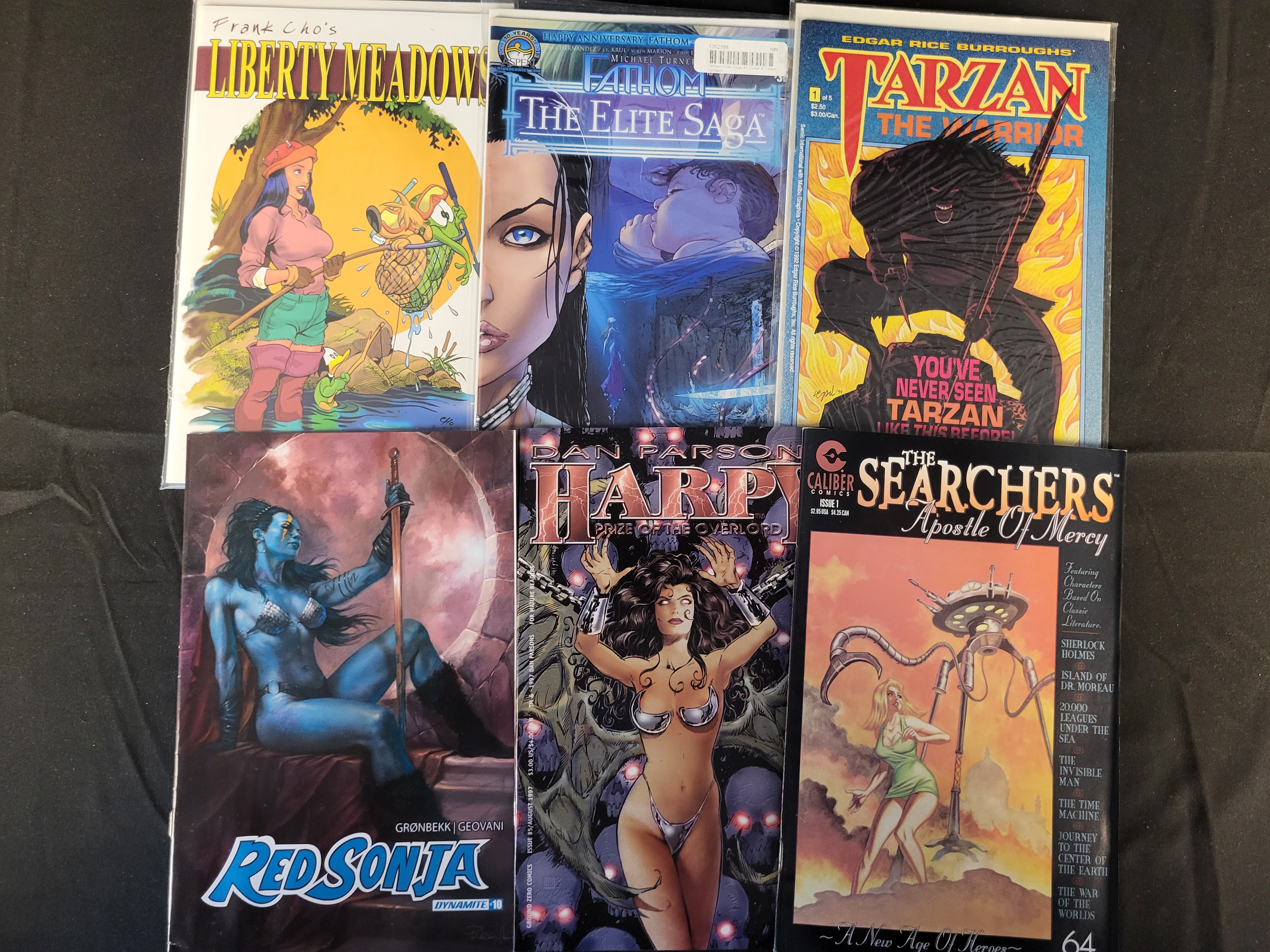 BID PER WHAT YOU SEE IN THE PHOTO, NOT THE AI GENERATED TITLES AND DESCRIPTIONS! A group of modern-age comic books from various independent and mainstream publishers. The collection features Edgar Rice Burroughs’ Tarzan: The Warrior Issue 1 (Malibu Graphics, 1992), Red Sonja Issue 10 (Dynamite Entertainment), Fathom: The Elite Saga (Aspen Comics), Harpy: Prize of the Overlord Issue 5 (Ground Zero Comics), The Searchers: Apostle of Mercy Issue 1 (Caliber Comics), and a Liberty Meadows volume by Frank Cho. The items are printed on standard comic stock with high-gloss full-color covers. Several items are housed in protective plastic sleeves.