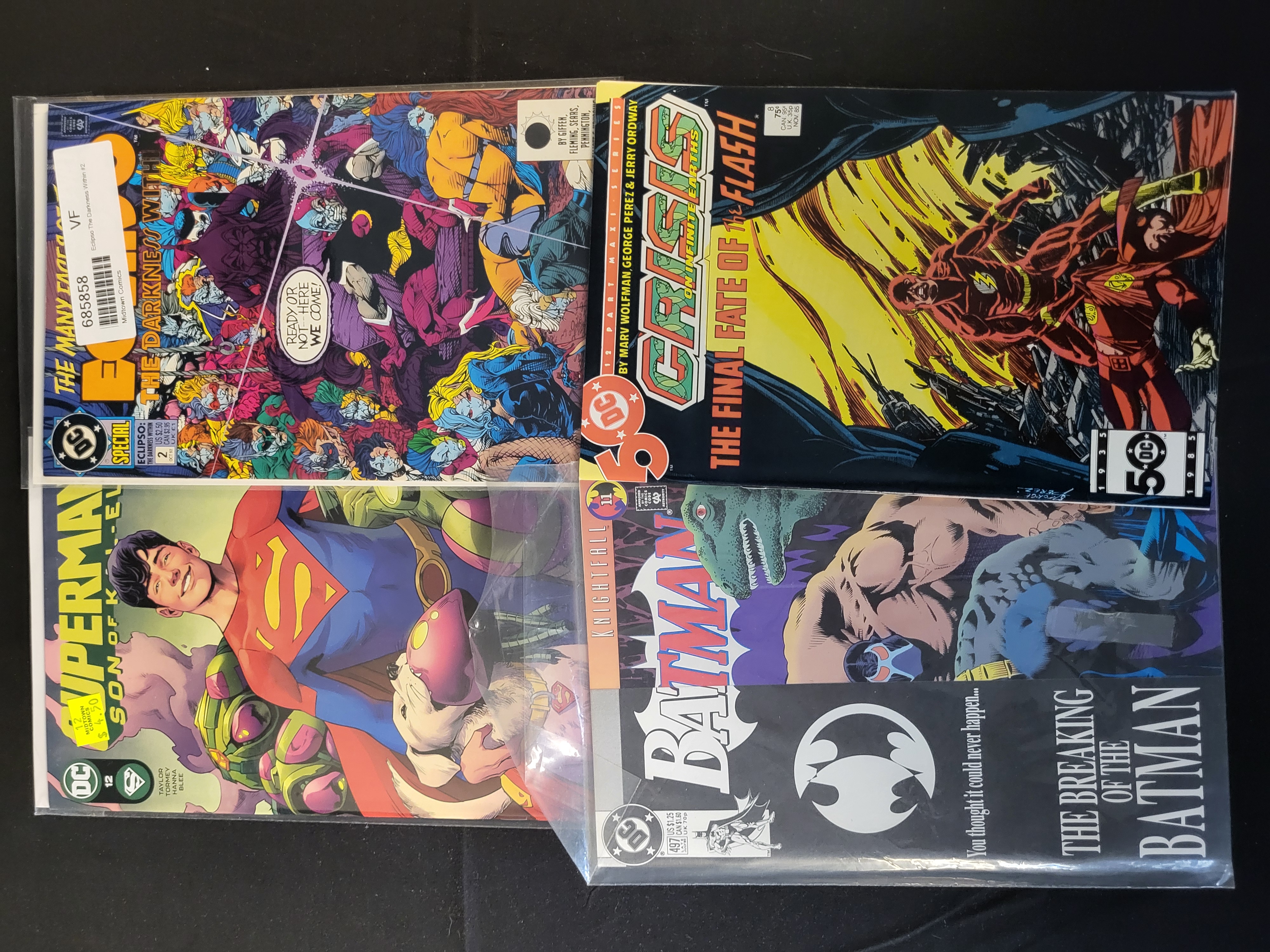 BID PER WHAT YOU SEE IN THE PHOTO, NOT THE AI GENERATED TITLES AND DESCRIPTIONS! A collection of DC Comics comic books featuring various titles and storylines published between 1985 and 2022. The group includes Crisis on Infinite Earths number 8 (November 1985), Batman number 497 (July 1993) from the Knightfall storyline, Eclipso: The Darkness Within number 2 (October 1992), and Superman: Son of Kal-El number 12 (August 2022). The covers feature full-color illustrations by artists including George Perez and Jerry Ordway. Each issue is housed in a clear plastic protective sleeve, with several sleeves displaying retail stickers from Midtown Comics. The books are staple-bound with printed paper covers and interiors.