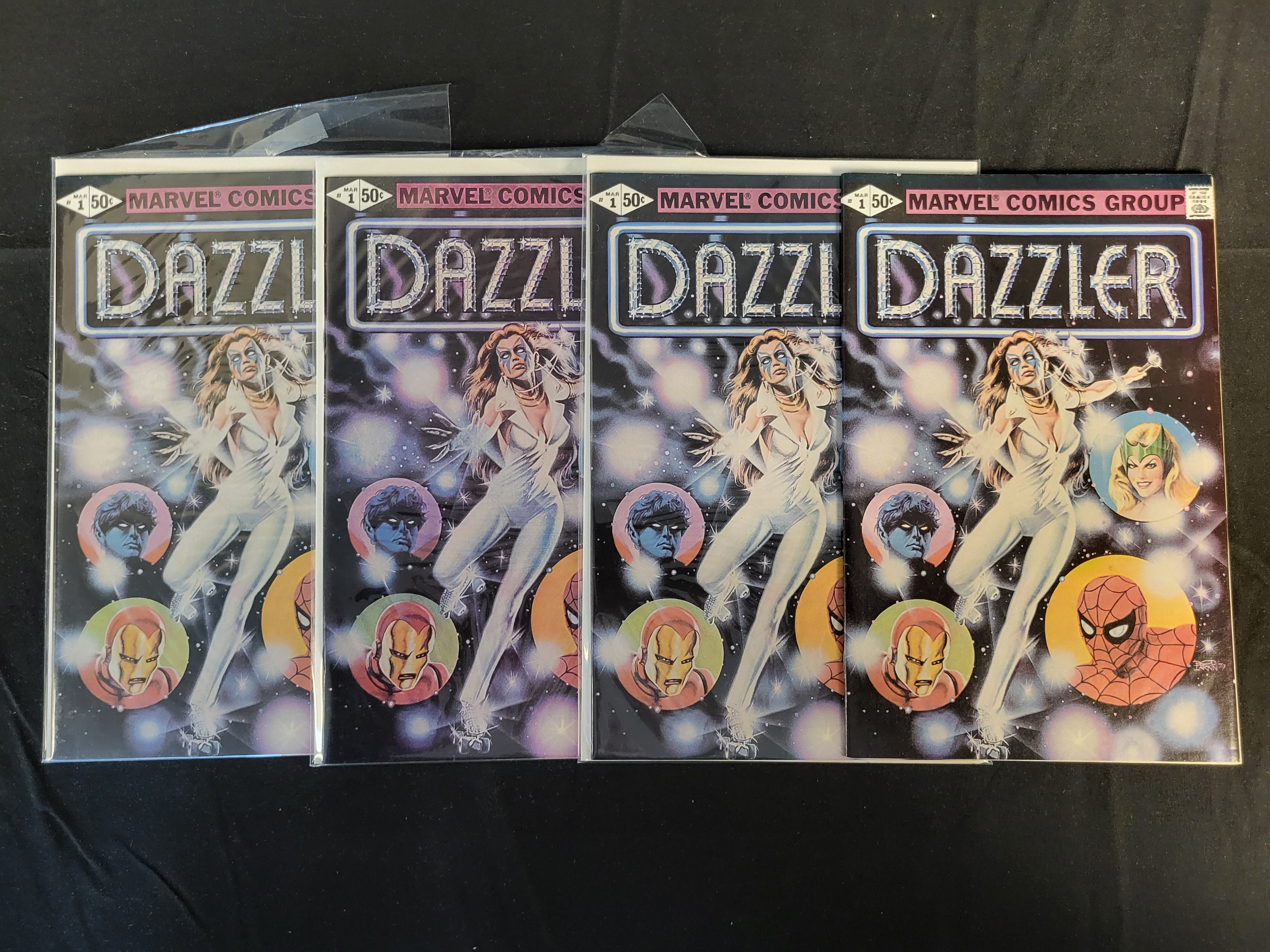 BID PER WHAT YOU SEE IN THE PHOTO, NOT THE AI GENERATED TITLES AND DESCRIPTIONS! A group of Marvel Comics Dazzler issue number 1, published in March 1981, representing the character’s first solo series. The cover art by Bob Larkin features the title character in a white jumpsuit and roller skates, surrounded by inset portraits of Spider-Man, Iron Man, Nightcrawler, and the Enchantress. The covers include the Marvel Comics Group banner and a printed price of 50 cents. Each comic is individually housed in a clear protective sleeve with a white backing board.