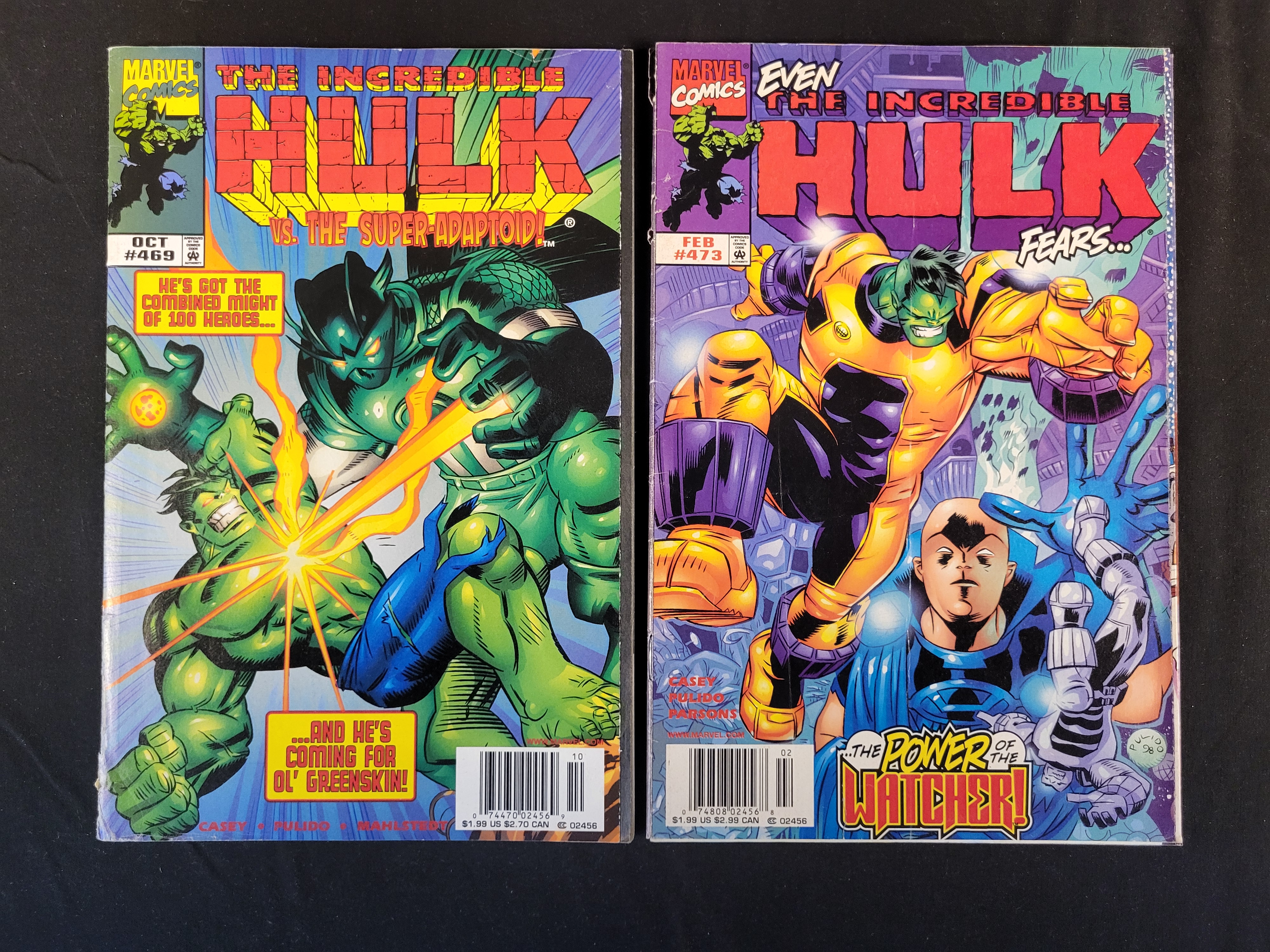 BID PER WHAT YOU SEE IN THE PHOTO, NOT THE AI GENERATED TITLES AND DESCRIPTIONS! A pair of Marvel Comics The Incredible Hulk comic books comprising issues #469 and #473. Issue #469, dated October 1998, is titled Vs. The Super-Adaptoid! and lists creators Casey, Pulido, and Mahlstedt. Issue #473, dated February 1999, is titled Even The Incredible Hulk Fears… The Power of the Watcher! and lists creators Casey, Pulido, and Parsons. Both issues are presented in a standard modern comic format with full-color illustrated covers and include original $1.99 US cover prices and barcodes.
