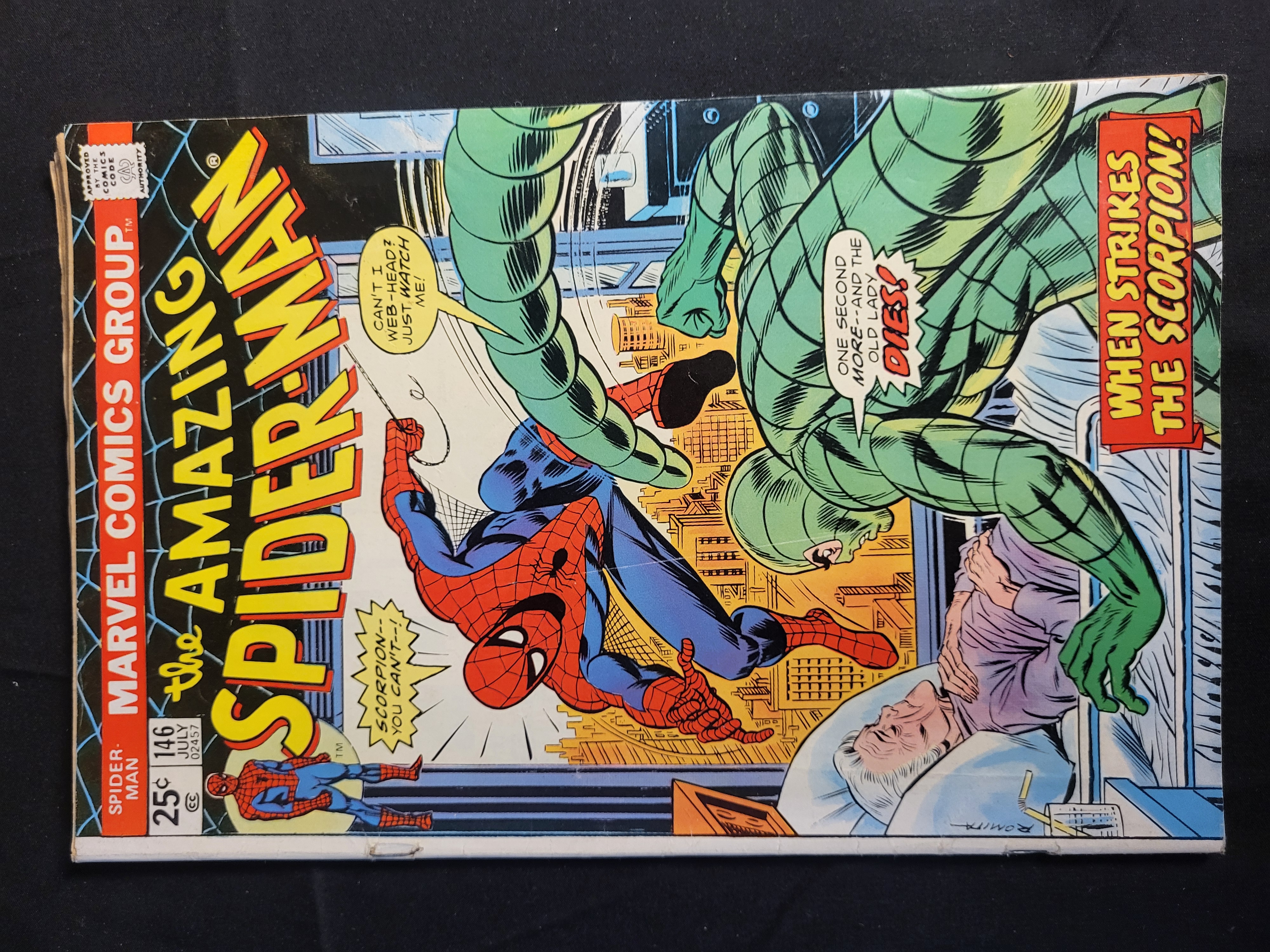 BID PER WHAT YOU SEE IN THE PHOTO, NOT THE AI GENERATED TITLES AND DESCRIPTIONS! Marvel Comics Group The Amazing Spider-Man issue number 146, published July 1975. This Bronze Age staple-bound paper periodical features cover artwork by John Romita Sr. depicting a confrontation between Spider-Man and the Scorpion in a hospital setting. The front cover includes the series title in yellow and red, a 25-cent price mark, and the Comics Code Authority seal. The issue features the story titled When Strikes the Scorpion! and includes several dialogue bubbles and captions.