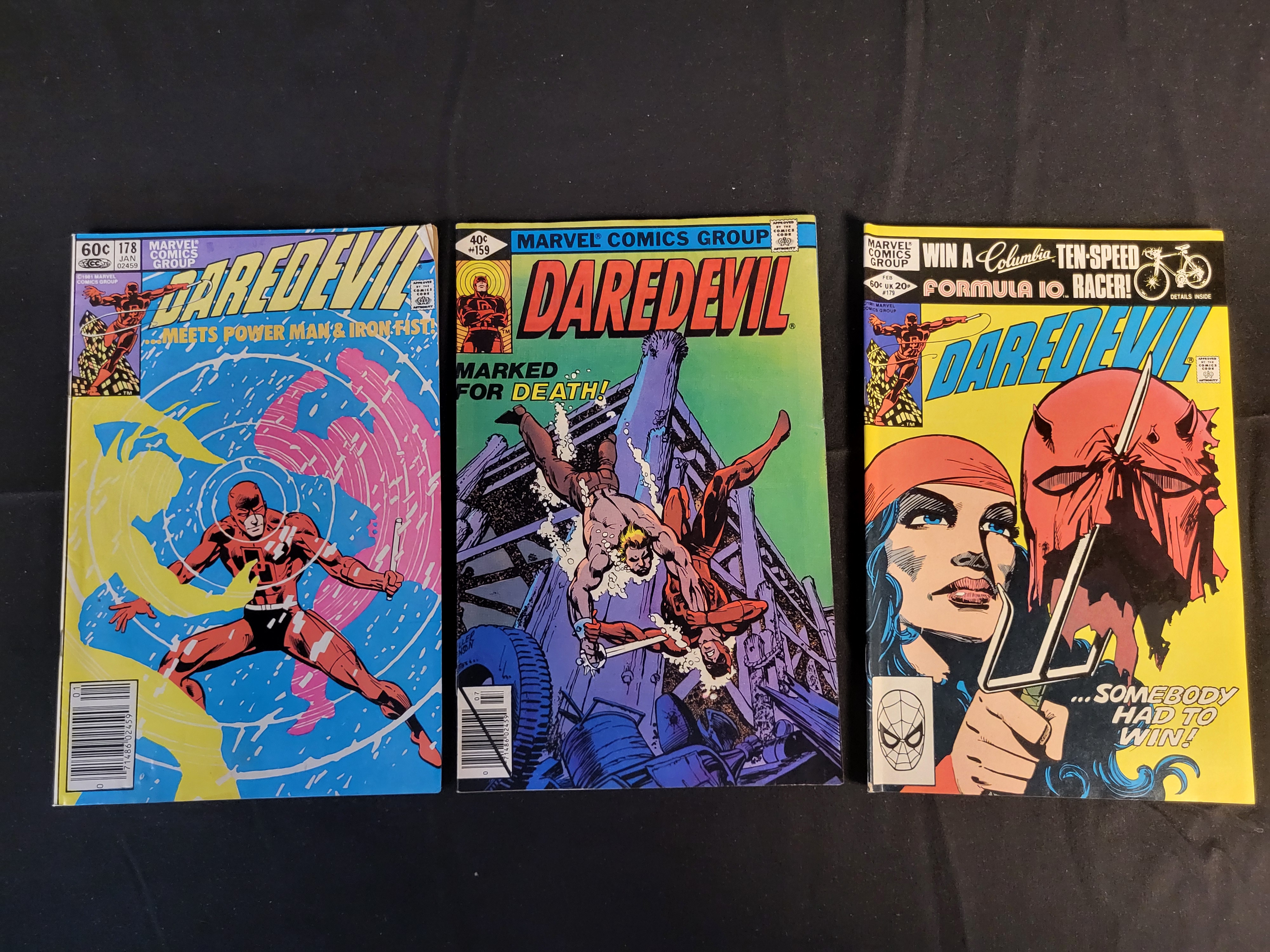 BID PER WHAT YOU SEE IN THE PHOTO, NOT THE AI GENERATED TITLES AND DESCRIPTIONS! A trio of vintage Marvel Comics Group Daredevil comic books from the late 1970s and early 1980s. This group includes issue number 159 titled Marked for Death! (1979), issue number 178 featuring a crossover with Power Man and Iron Fist (1982), and issue number 179 featuring Elektra on the cover (1982). The comics are printed on standard newsprint and feature color illustrations. Original cover price markings of 40 cents and 60 cents are present. Each issue is presented in a protective plastic sleeve.