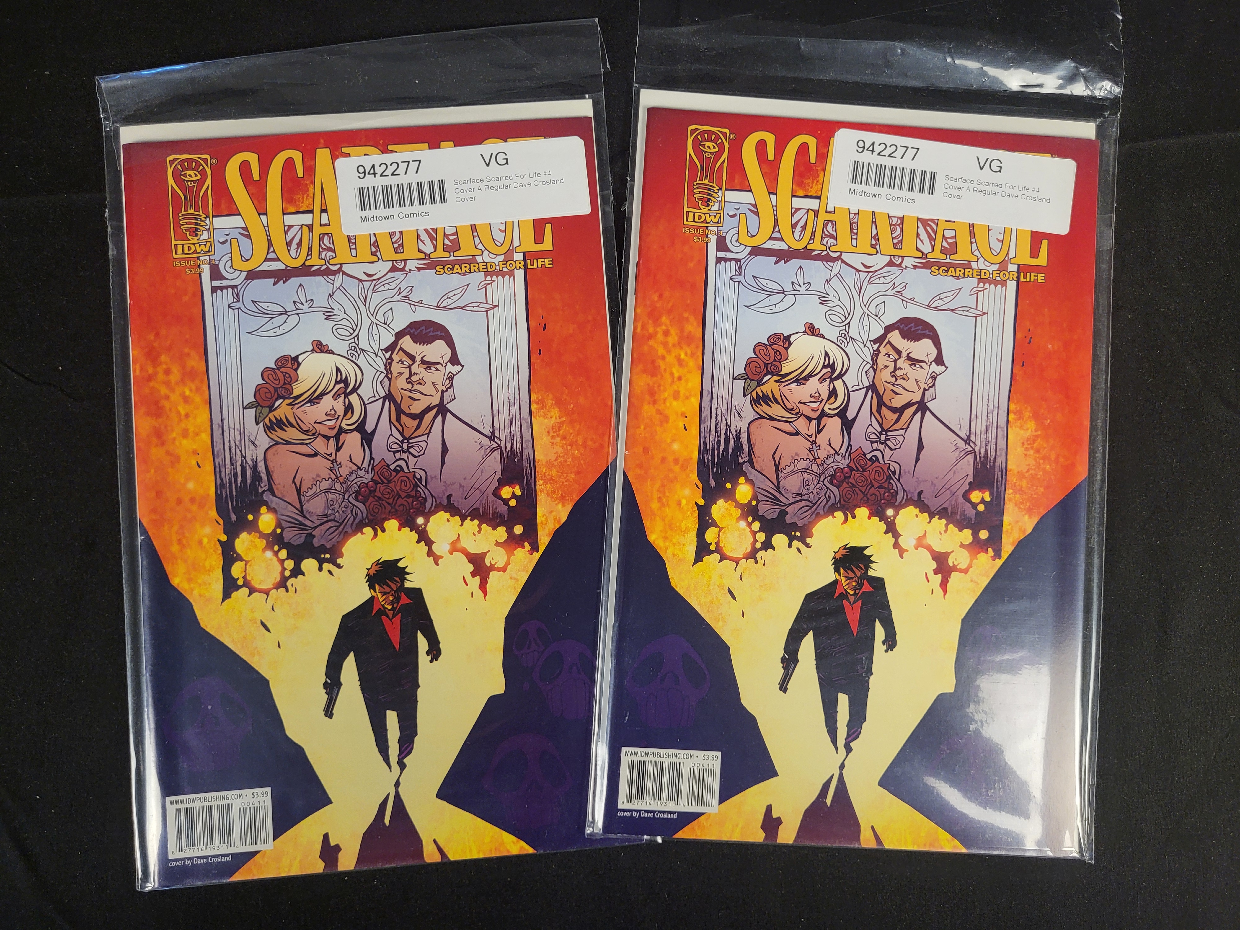 BID PER WHAT YOU SEE IN THE PHOTO, NOT THE AI GENERATED TITLES AND DESCRIPTIONS! A pair of Scarface: Scarred For Life issue number 4 comic books published by IDW Publishing. These issues feature Cover A, the regular cover art by Dave Crosland, which depicts a stylized wedding portrait set against a fiery background with a silhouetted gunman and skulls. Each comic is housed in a clear plastic protective sleeve with a white backing board. The cover price is listed as 3.99 dollars. Retail stickers from Midtown Comics are present on the sleeves.