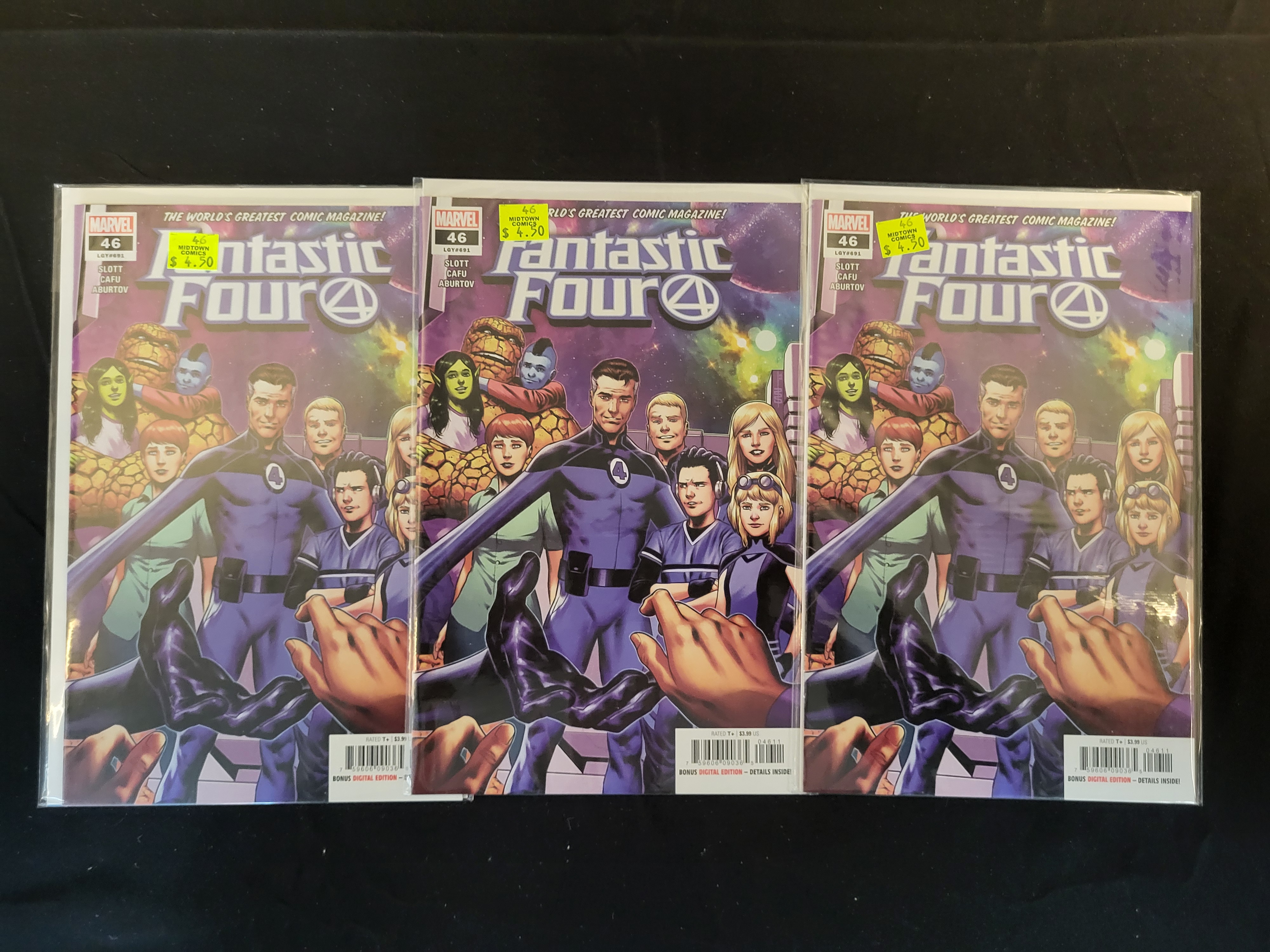 BID PER WHAT YOU SEE IN THE PHOTO, NOT THE AI GENERATED TITLES AND DESCRIPTIONS! This lot features three copies of Fantastic Four issue number 46 (Legacy number 691), published by Marvel Comics in 2022. The creative team for this issue includes writer Dan Slott and artists Cafu and Jesus Aburtov. The cover art by Cafu depicts a group scene of various characters and includes the series tagline The World’s Greatest Comic Magazine. Each comic is individually presented in a clear protective plastic sleeve with a white backing board. Yellow retailer price tags from Midtown Comics are present on the exterior of the protective sleeves. The items exhibit standard modern comic book construction with staple binding and glossy covers.