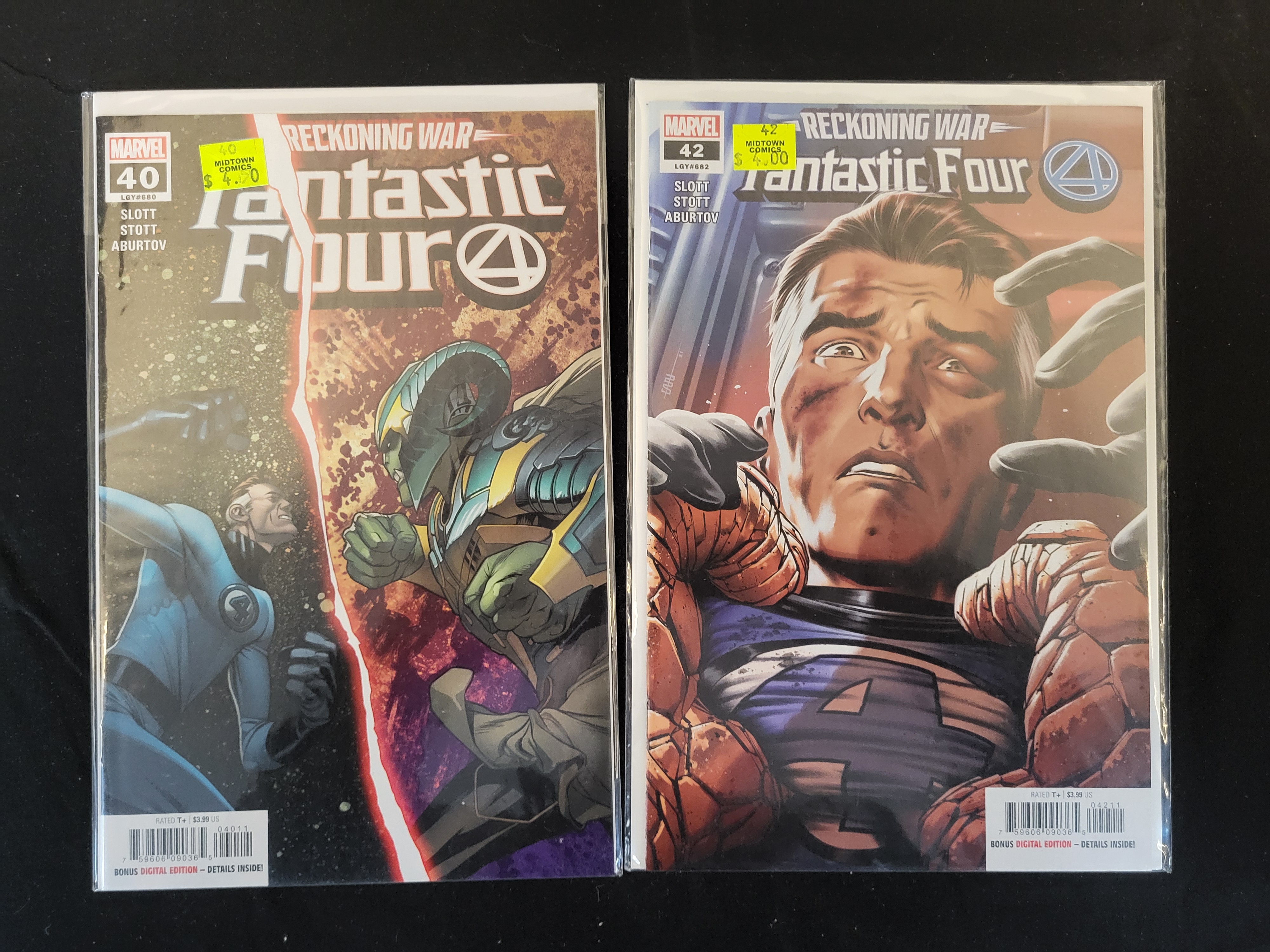 BID PER WHAT YOU SEE IN THE PHOTO, NOT THE AI GENERATED TITLES AND DESCRIPTIONS! A pair of Marvel Comics comic books from the Fantastic Four series (2018-2022) featuring the Reckoning War storyline. The lot includes issue number 40 (Legacy 680) and issue number 42 (Legacy 682), both published in 2022. The issues are written by Dan Slott with interior and cover art by Rachael Stott and colors by Jesus Aburtov. The cover for issue 40 illustrates Mr. Fantastic, while issue 42 features The Thing. Both items are individually bagged and boarded for preservation. Yellow retail labels from Midtown Comics are attached to the front of the protective bags.