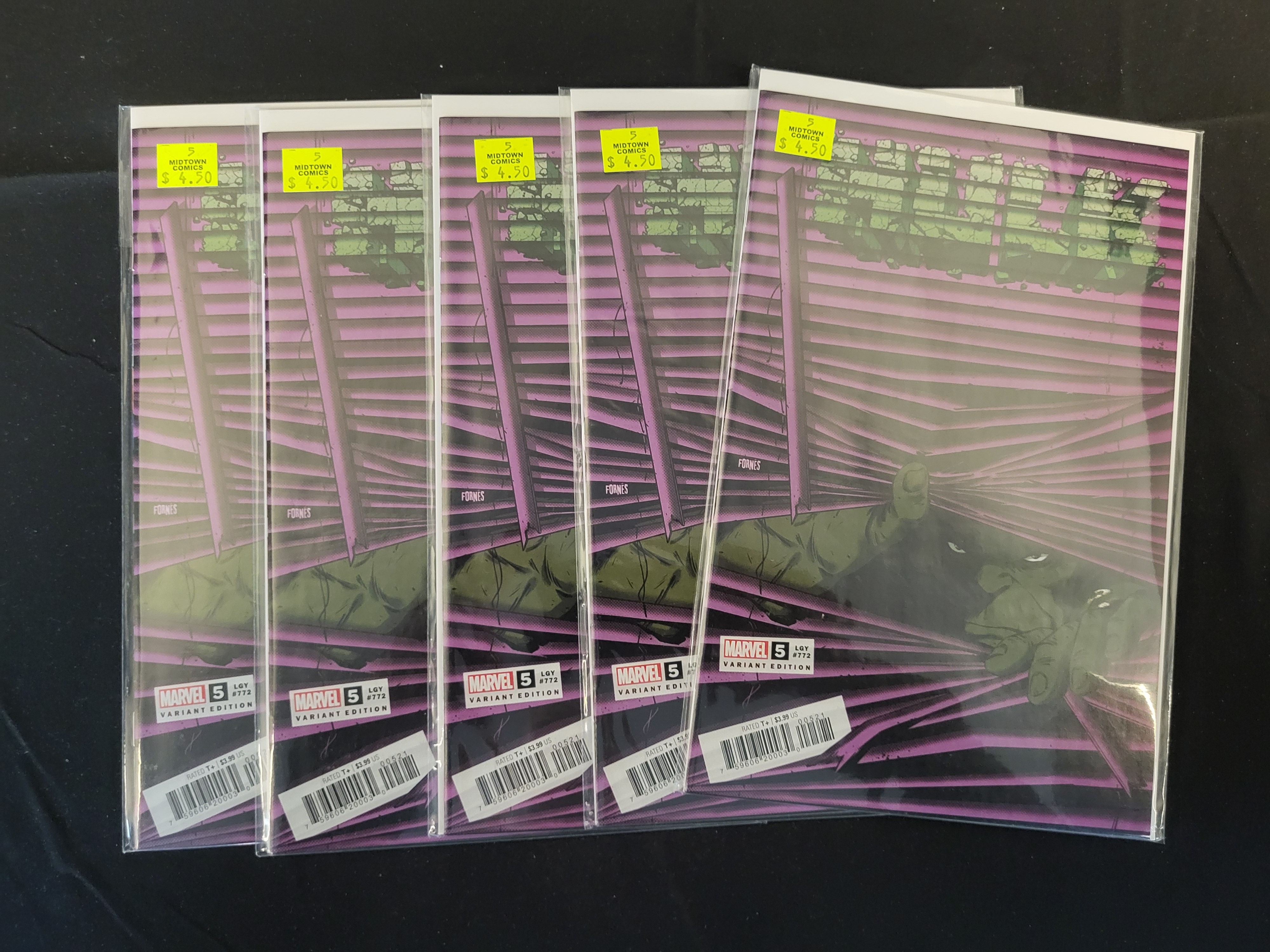 BID PER WHAT YOU SEE IN THE PHOTO, NOT THE AI GENERATED TITLES AND DESCRIPTIONS! A group of modern era comic books, Marvel’s Hulk issue #5 (Legacy #772), published in 2022. This lot features the variant edition with cover art by Jorge Fornes, depicting the character peering through horizontal window shades rendered in pink and purple tones. Each comic includes the Marvel branding, issue number, legacy number, and variant edition designation on the front cover. The artist’s name Fornes is printed on the cover illustration. Each issue is individually housed in a protective plastic bag with a white backing board. Yellow retail price stickers from Midtown Comics are affixed to the exterior of the plastic bags.