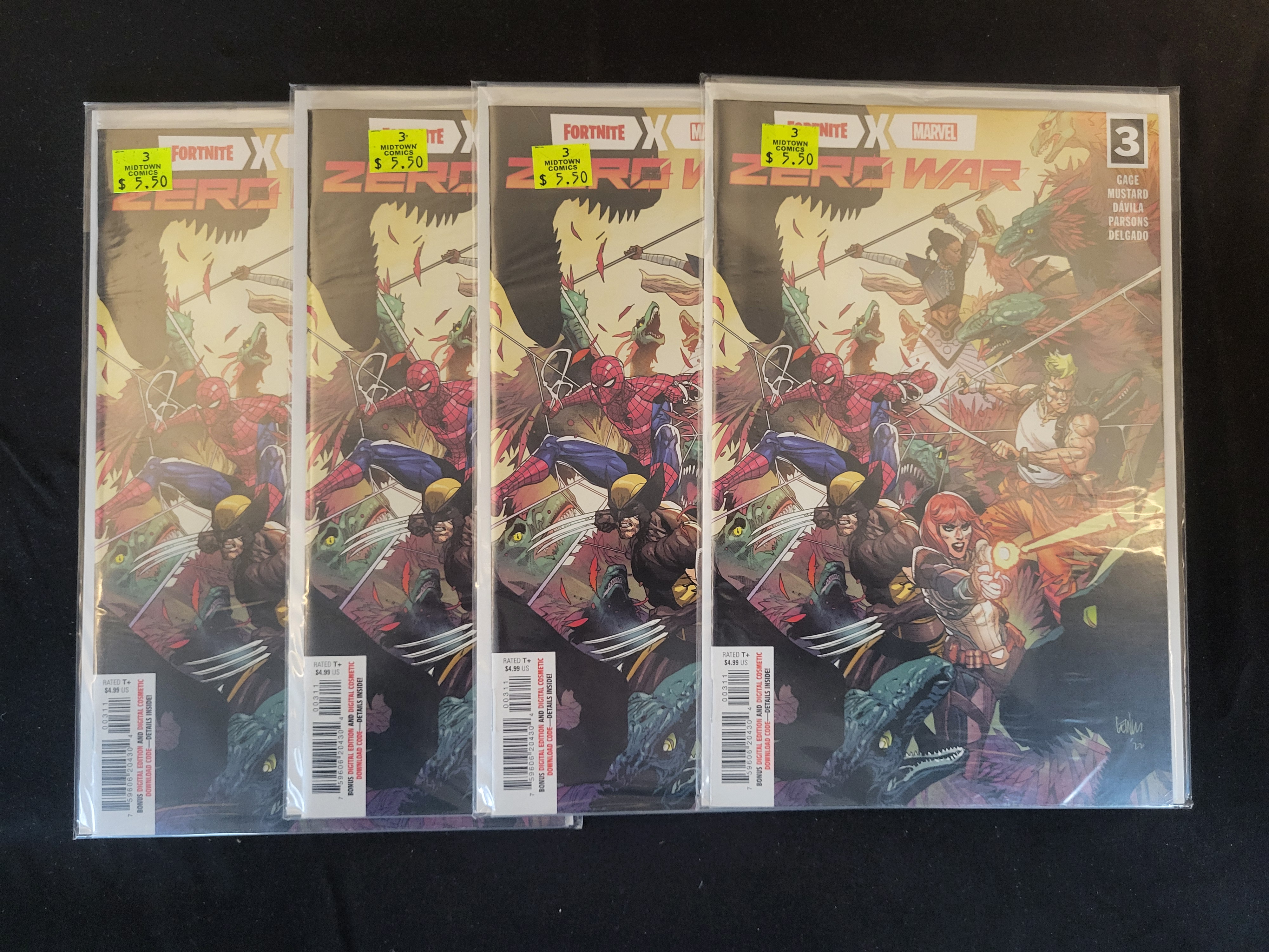 BID PER WHAT YOU SEE IN THE PHOTO, NOT THE AI GENERATED TITLES AND DESCRIPTIONS! A group of modern comic books, Fortnite X Marvel: Zero War issue #3, published in 2022 by Marvel Comics in collaboration with Epic Games. The cover art depicts a battle scene featuring characters including Spider-Man and Wolverine. The creative team listed on the cover includes Christos Gage, Donald Mustard, Sergio Davila, Sean Parsons, and Edgar Delgado. Each issue is Rated T+ and includes a promotional callout for a bonus digital cosmetic download code. The comics are individually housed in clear protective sleeves with cardboard backing boards. Each sleeve retains a yellow retail price sticker from Midtown Comics.