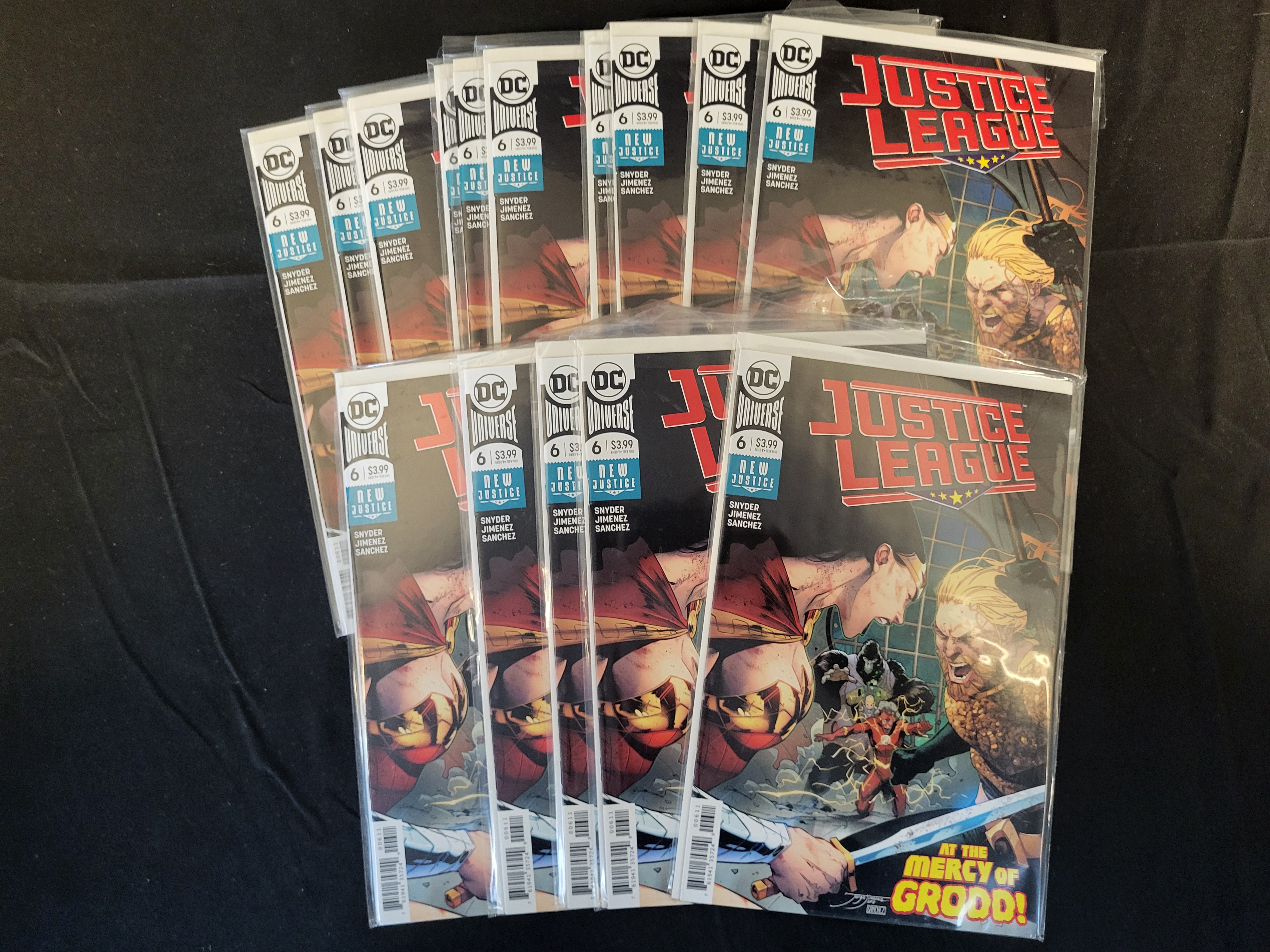 BID PER WHAT YOU SEE IN THE PHOTO, NOT THE AI GENERATED TITLES AND DESCRIPTIONS! A collection of Justice League issue no. 6 comic books from the DC Universe New Justice series. The cover art is by the creative team of Scott Snyder, Jorge Jimenez, and Alejandro Sanchez, featuring characters Wonder Woman, Aquaman, and the Flash. The cover includes the text At the Mercy of Grood!. Each comic is individually presented in a protective plastic sleeve with a cardboard backing.