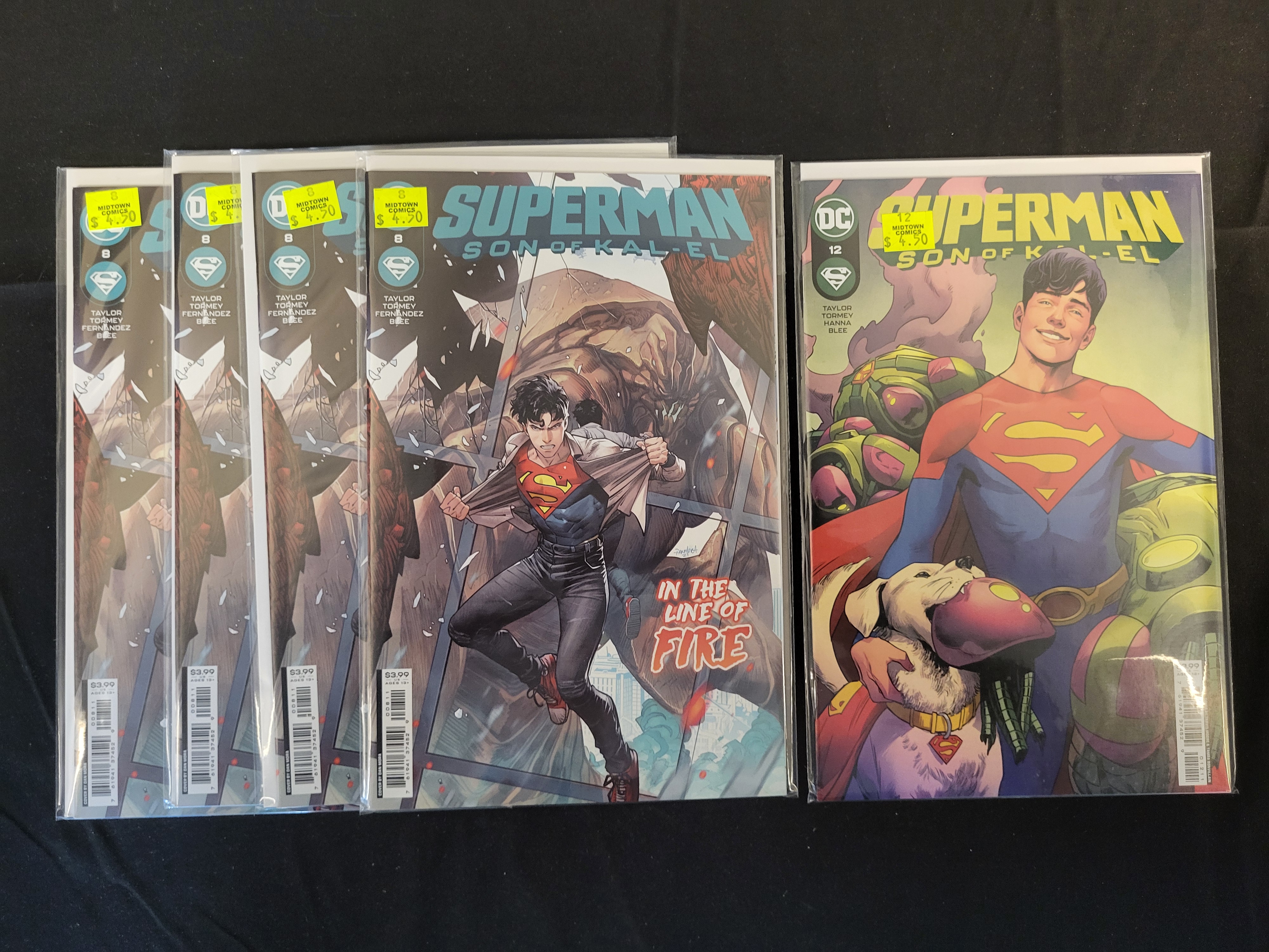 BID PER WHAT YOU SEE IN THE PHOTO, NOT THE AI GENERATED TITLES AND DESCRIPTIONS! A group of modern DC comic books from the Superman: Son of Kal-El series, featuring issues 8 and 12. The series is written by Tom Taylor with art by Cian Tormey and other contributors. Issue 12 is identified as a 2022 first printing with Cover A by Travis Moore. The items are composed of printed paper with vibrant color illustrations. Each comic is housed in a protective clear plastic sleeve with a white cardboard backing. The covers include the DC Comics logo, issue numbers, and creator credits. Yellow retail price stickers from Midtown Comics are attached to the exterior of the plastic sleeves.