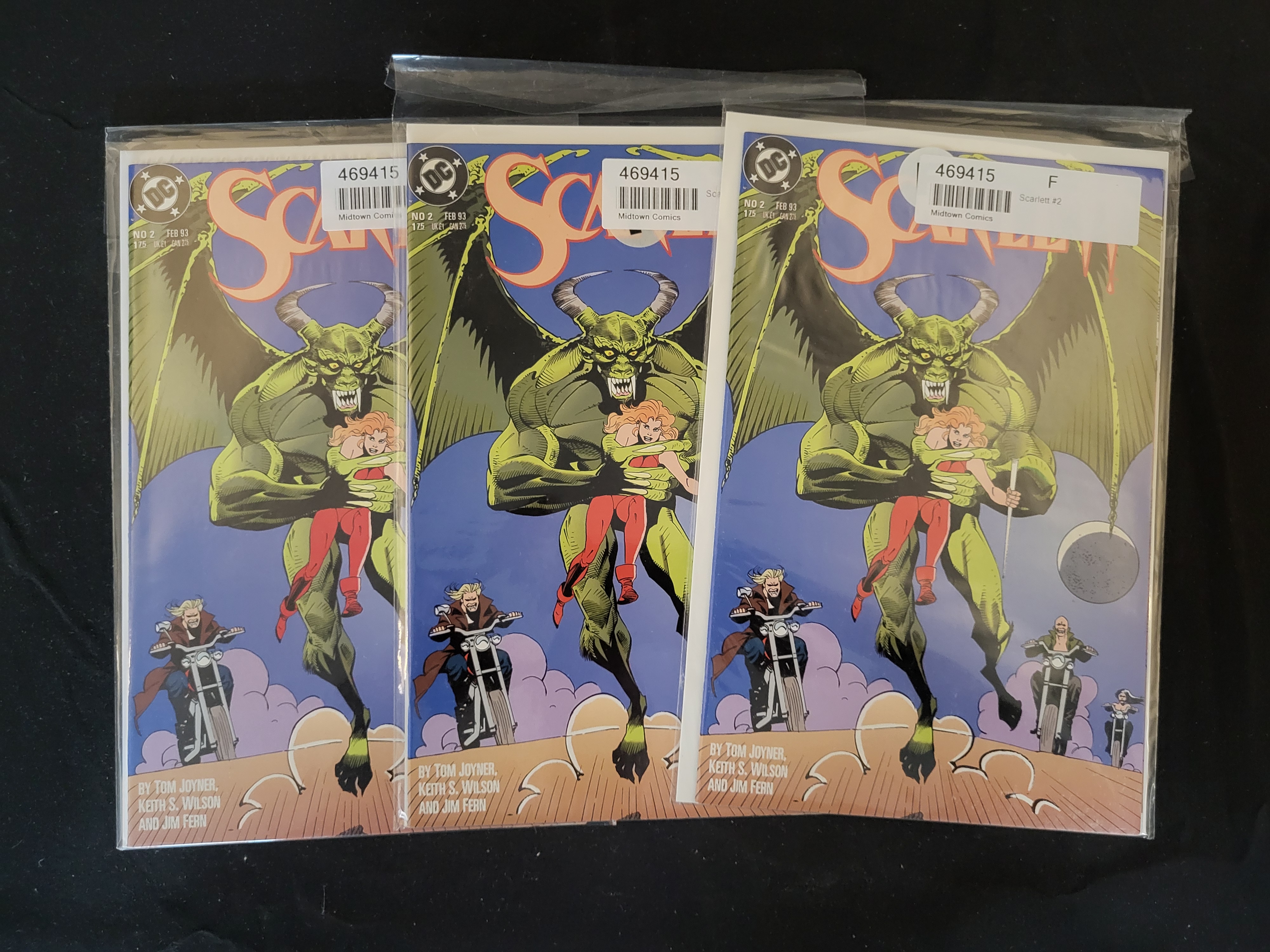BID PER WHAT YOU SEE IN THE PHOTO, NOT THE AI GENERATED TITLES AND DESCRIPTIONS! A trio of modern-age comic books from the DC Comics series Scarlett, specifically issue number 2 dated February 1993. The cover artwork is credited to Tom Joyner, Keith S. Wilson, and Jim Fern. The illustration depicts a large, winged green creature holding a red-haired woman, set against a background featuring figures on motorcycles. Each comic is individually housed in a clear plastic protective sleeve. Modern inventory stickers from Midtown Comics are affixed to the upper portion of each sleeve.