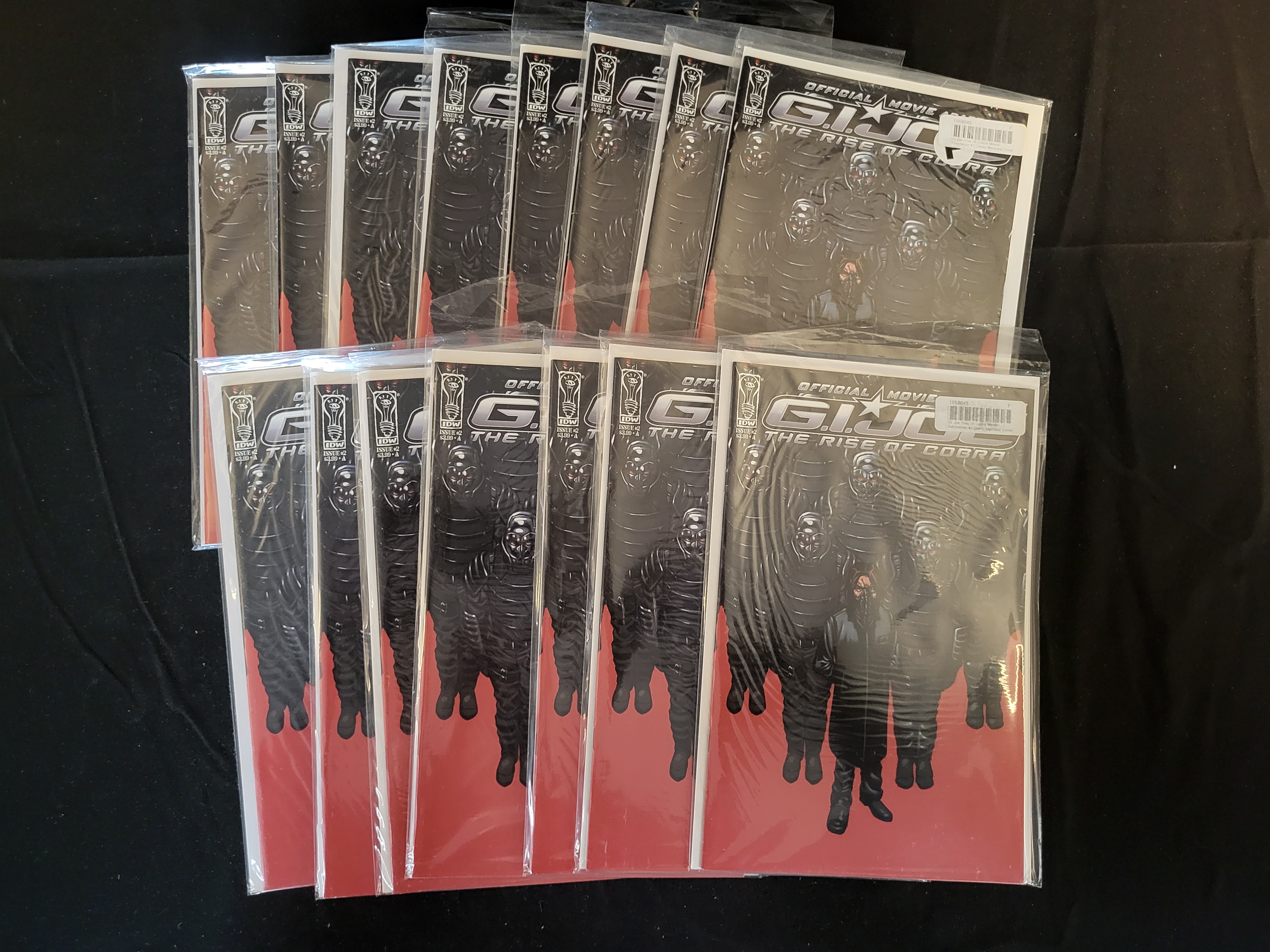 BID PER WHAT YOU SEE IN THE PHOTO, NOT THE AI GENERATED TITLES AND DESCRIPTIONS! A collection of modern-era comic books published by IDW Publishing. The lot consists of multiple copies of G.I. Joe: The Rise of Cobra – Official Movie Adaptation, Issue #2. The cover art features a central figure in a black trench coat and mask positioned in front of a group of Neo-Viper soldiers, set against a red and black background. Each comic displays the series title, issue number, IDW logo, and original retail price on the front cover. The items are individually housed in clear protective plastic sleeves. Some sleeves retain external retail labels and barcodes.