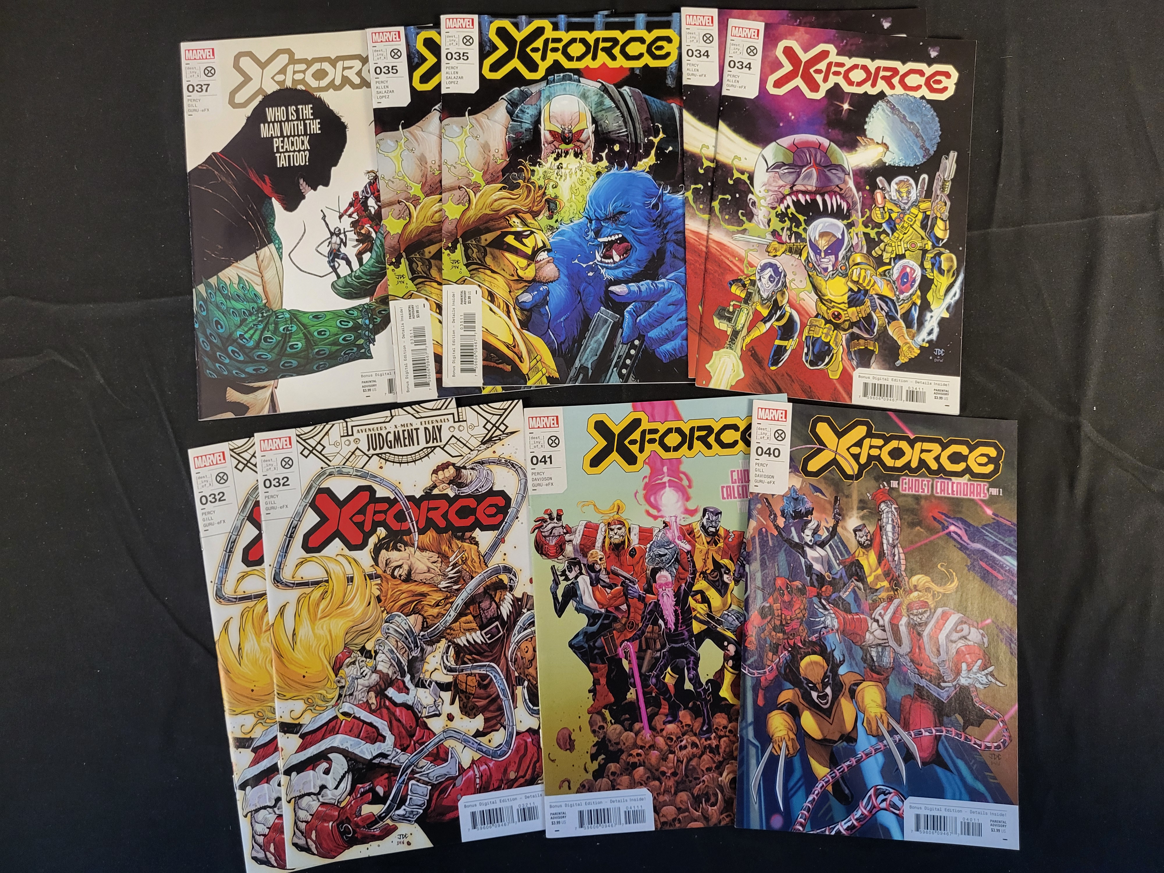 BID PER WHAT YOU SEE IN THE PHOTO, NOT THE AI GENERATED TITLES AND DESCRIPTIONS! A collection of modern-era Marvel comic books from the X-Force series, featuring issue numbers 032, 034, 035, 037, 040, and 041. The issues showcase cover art and storylines including Judgment Day and The Ghost Calendars. Creative credits include writer Benjamin Percy and artists Robert Gill and Chris Allen. The comic books are printed in full color on standard glossy paper stock. The collection includes duplicate copies of several issues.