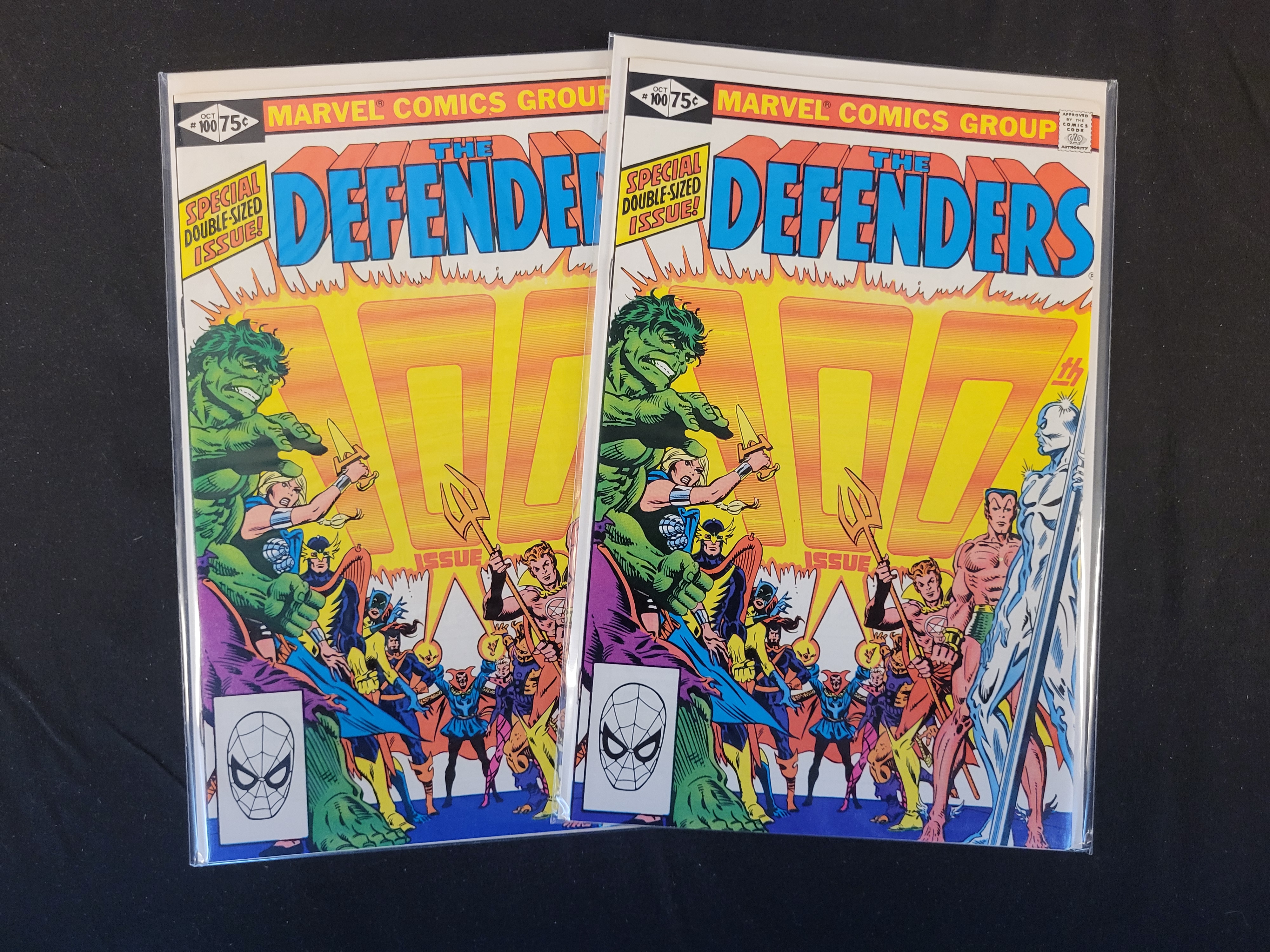 BID PER WHAT YOU SEE IN THE PHOTO, NOT THE AI GENERATED TITLES AND DESCRIPTIONS! A pair of vintage comic books published by Marvel Comics Group, titled The Defenders issue number 100, dated October 1981. These examples are designated as a Special Double-Sized Issue with a cover price of 75 cents. The cover art features a large 100 graphic and depicts various characters including the Hulk, Silver Surfer, Namor the Sub-Mariner, and Doctor Strange. A black and white Spider-Man head logo is present in the lower-left corner box. Each comic is printed on standard newsprint with a glossy cover.