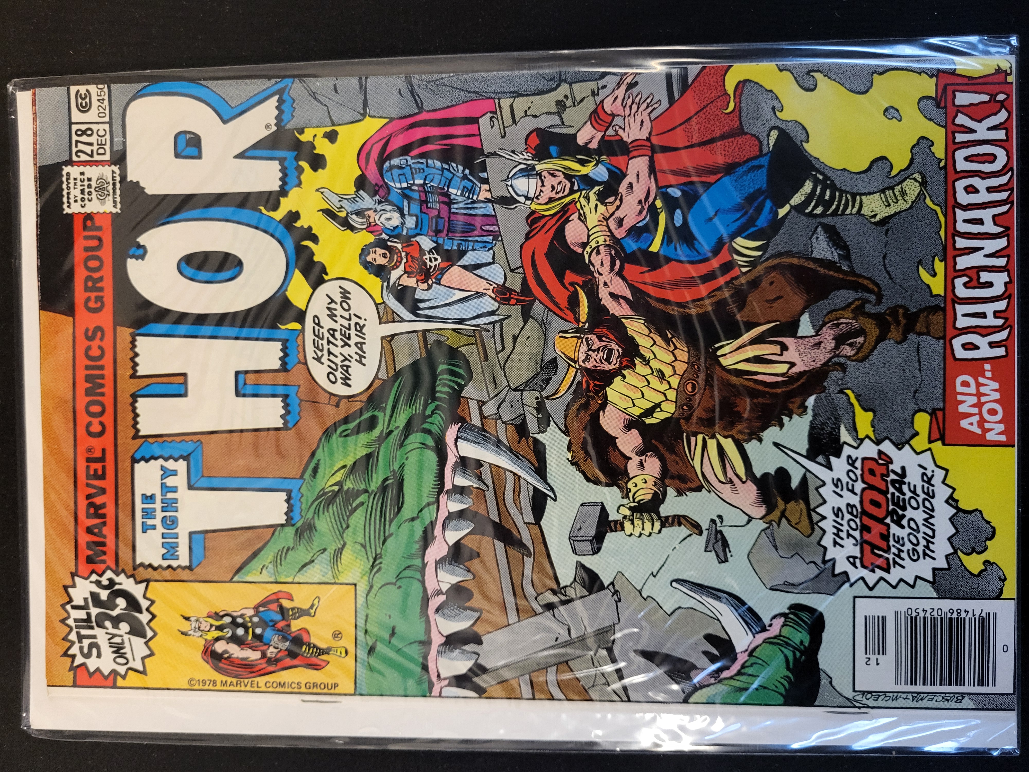 BID PER WHAT YOU SEE IN THE PHOTO, NOT THE AI GENERATED TITLES AND DESCRIPTIONS! This is a single comic book, Marvel Comics’ The Mighty Thor issue number 278, published in December 1978. This Bronze Age publication features cover artwork by John Buscema and Bob McLeod depicting a battle scene with the headline And Now– Ragnarok!. The front cover includes the Marvel Comics Group logo, the Comics Code Authority seal, a 35-cent price point, and a UPC barcode in the lower right corner. The item is presented in a clear plastic protective sleeve with a white backing board.