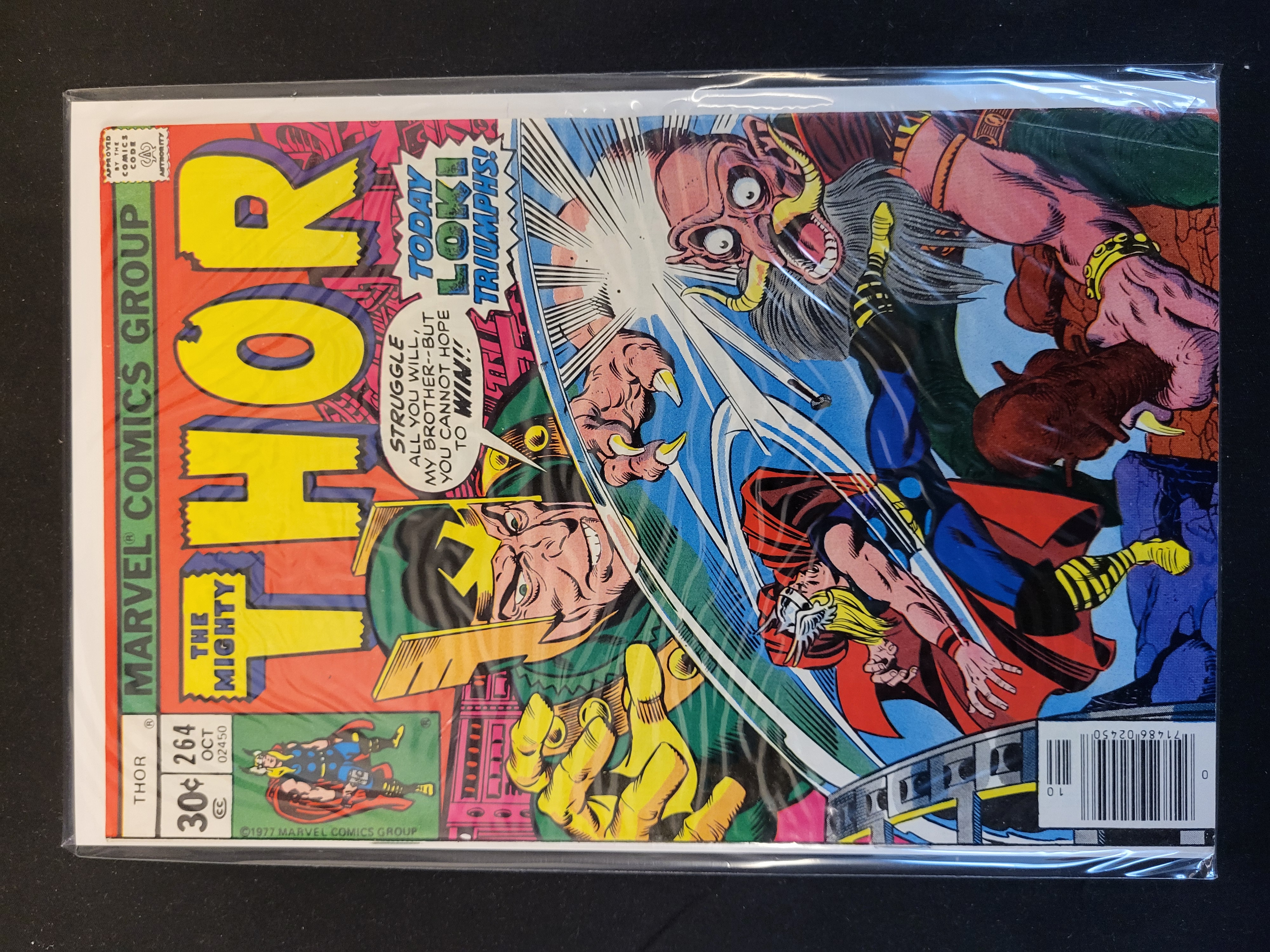 BID PER WHAT YOU SEE IN THE PHOTO, NOT THE AI GENERATED TITLES AND DESCRIPTIONS! This is a copy of The Mighty Thor issue No. 264, published by Marvel Comics Group and dated October 1977. This Bronze Age comic features cover art depicting Thor in combat with Loki and a large monstrous figure, including the headline Today Loki Triumphs! and dialogue bubbles. The front cover displays a 30 cent original price, the Comics Code Authority seal, and a UPC barcode identifying it as a newsstand edition. The publication is printed on standard comic book paper with a color-printed cover.