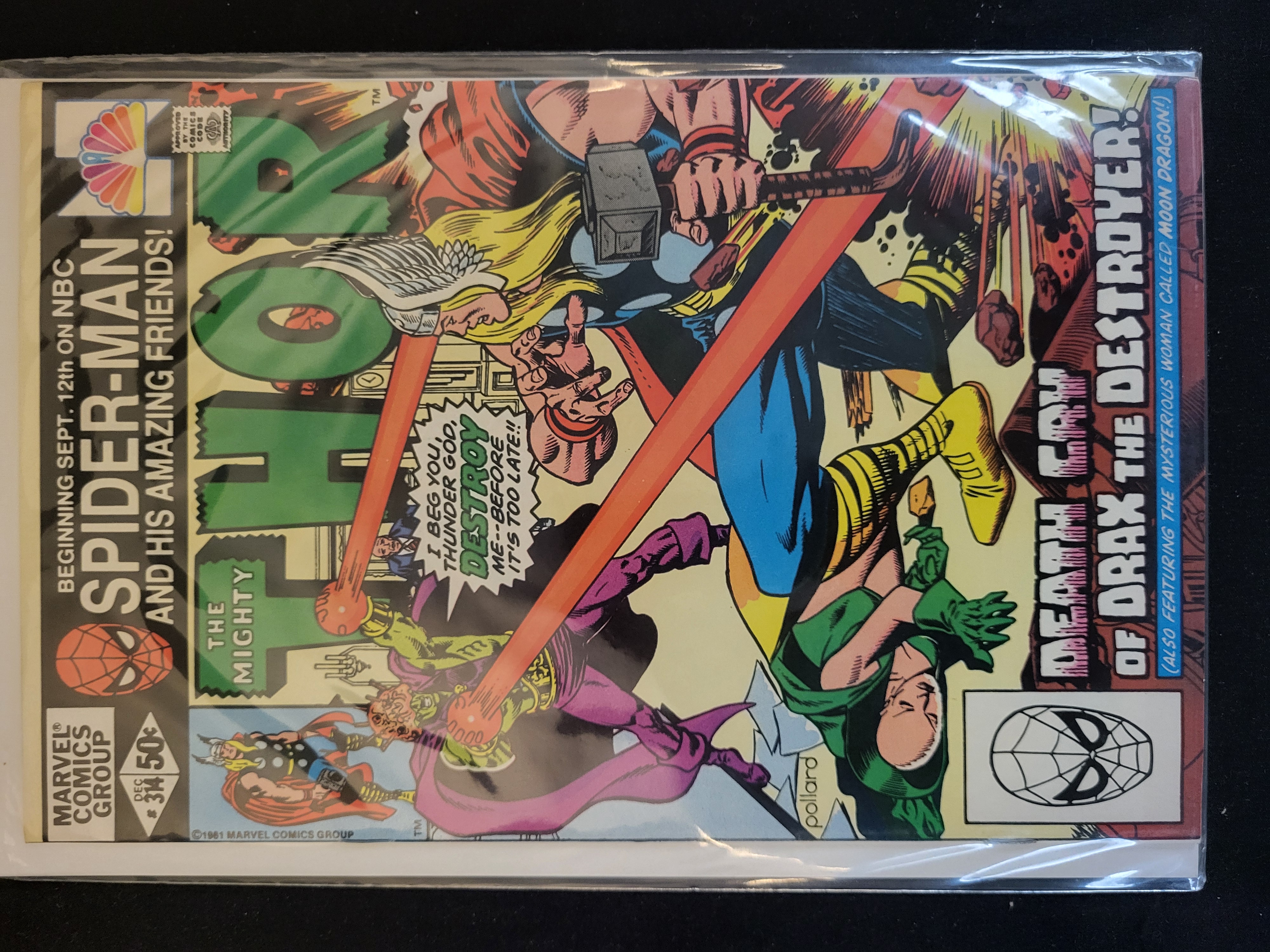 BID PER WHAT YOU SEE IN THE PHOTO, NOT THE AI GENERATED TITLES AND DESCRIPTIONS! A single issue of The Mighty Thor, number 314, published by the Marvel Comics Group in December 1981. The cover features art by Keith Pollard, whose signature is visible in the lower right quadrant. The illustration depicts a battle between Thor and Drax the Destroyer, accompanied by the headline Death Cry of Drax the Destroyer! and a promotional side banner for the NBC television series Spider-Man and His Amazing Friends. The cover includes the Marvel Comics Group logo, the Comics Code Authority seal, and a printed price of 50 cents. The comic is housed in a clear protective plastic sleeve with a white backing board.