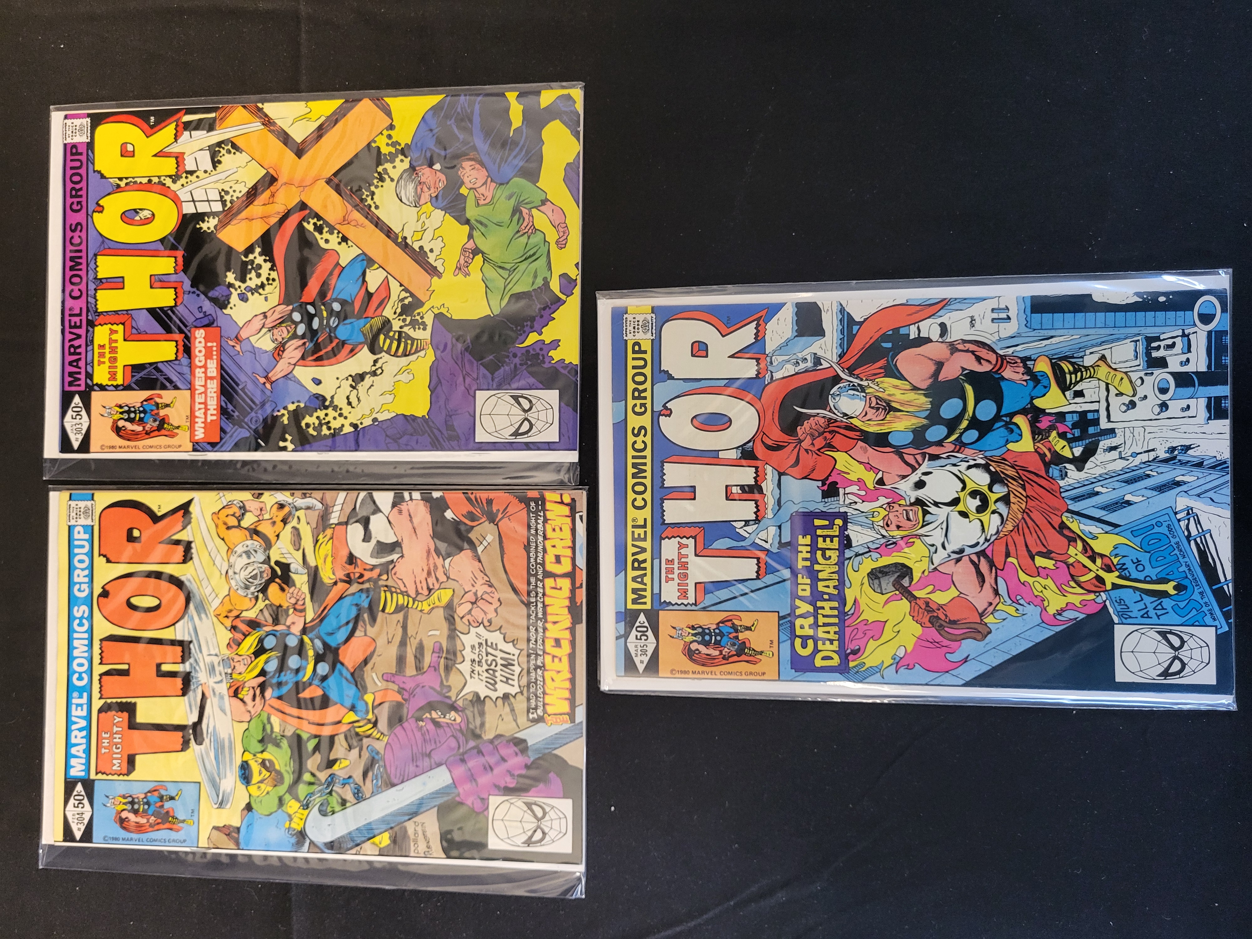 BID PER WHAT YOU SEE IN THE PHOTO, NOT THE AI GENERATED TITLES AND DESCRIPTIONS! This lot consists of a trio of vintage comic books from The Mighty Thor series published by Marvel Comics Group. The collection includes issue numbers 303, 304, and 305, dating from early 1981. Each comic features a 50-cent original cover price. Issue 304 depicts a confrontation with the Wrecking Crew, and issue 305 is titled Cry of the Death-Angel. The covers feature dynamic action illustrations typical of the Bronze Age era. The comics are printed on standard newsprint and are individually housed in clear protective sleeves with white backing boards.