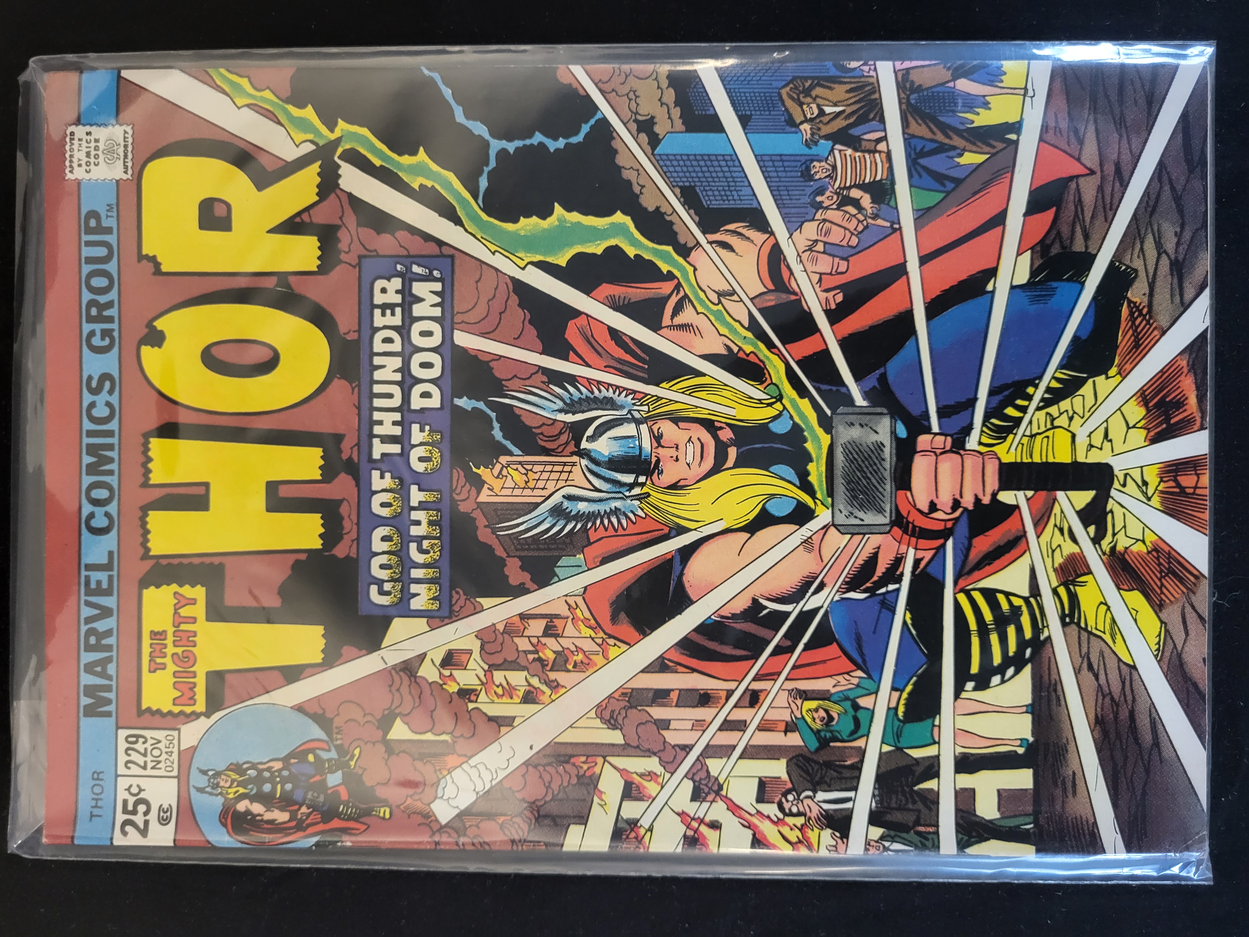 BID PER WHAT YOU SEE IN THE PHOTO, NOT THE AI GENERATED TITLES AND DESCRIPTIONS! This comic book is The Mighty Thor issue number 229, published by Marvel Comics Group in November 1974. The cover art features Thor wielding Mjolnir with the subtitle God of Thunder, Night of Doom!. This issue is noted in market consensus for containing a house advertisement for The Incredible Hulk number 181. The cover includes standard period branding, including the Marvel Comics Group vertical bar, a 25-cent price point, and the Comics Code Authority seal of approval. The item is encased in a clear plastic protective sleeve.
