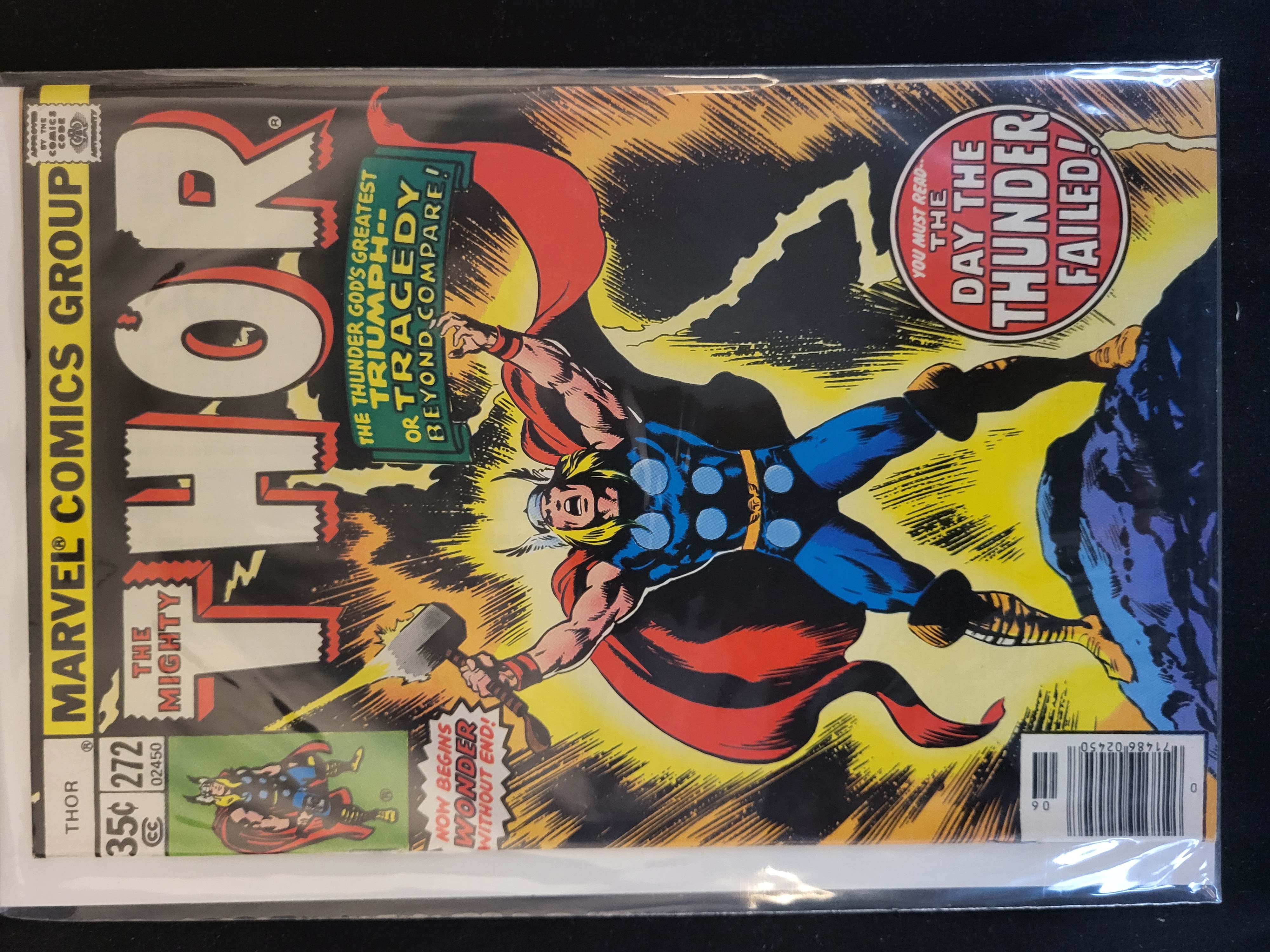 BID PER WHAT YOU SEE IN THE PHOTO, NOT THE AI GENERATED TITLES AND DESCRIPTIONS! A vintage Bronze Age comic book titled The Mighty Thor issue number 272 published by Marvel Comics Group in 1978. The cover features artwork by John Buscema depicting the character Thor against a lightning-strike background with the story title The Day the Thunder Failed! displayed in a circular callout. This issue features the first appearance of Skrymir. The front cover includes a 35 cent price point, the Comics Code Authority seal, and a barcode. The item is presented in a clear protective plastic sleeve with a white backing board.