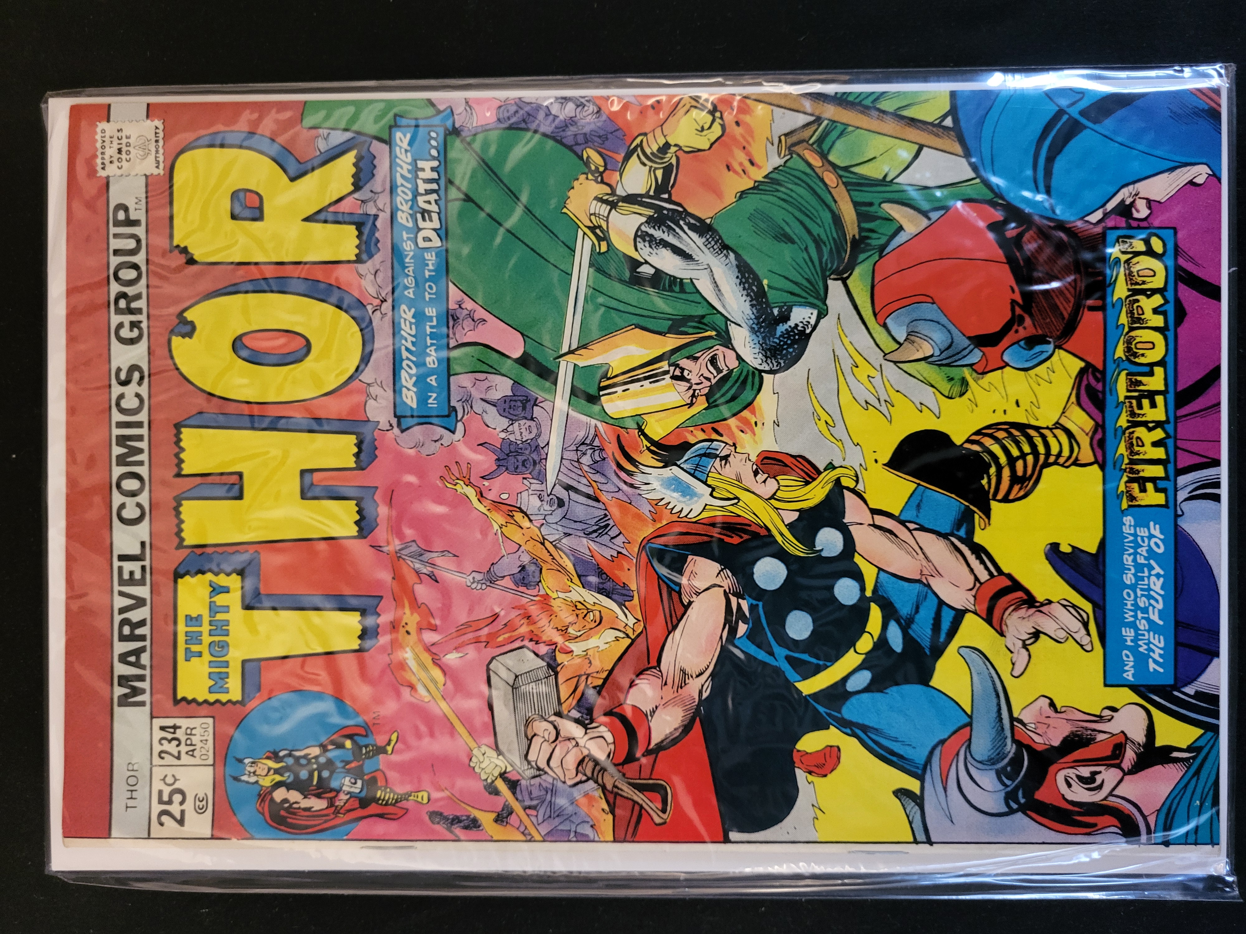 BID PER WHAT YOU SEE IN THE PHOTO, NOT THE AI GENERATED TITLES AND DESCRIPTIONS! Marvel The Mighty Thor number 234. This is a single issue comic book published by the Marvel Comics Group in April 1975. The cover art features an illustration of Thor in combat with Loki and other characters, accompanied by the text Brother Against Brother In A Battle To The Death and a side banner mentioning The Fury Of Firelord. The corner box displays the 25-cent original price, the issue number, and the month of publication, alongside the Comics Code Authority seal. The item is printed on newsprint and presented in a clear plastic protective sleeve with a white backing board.