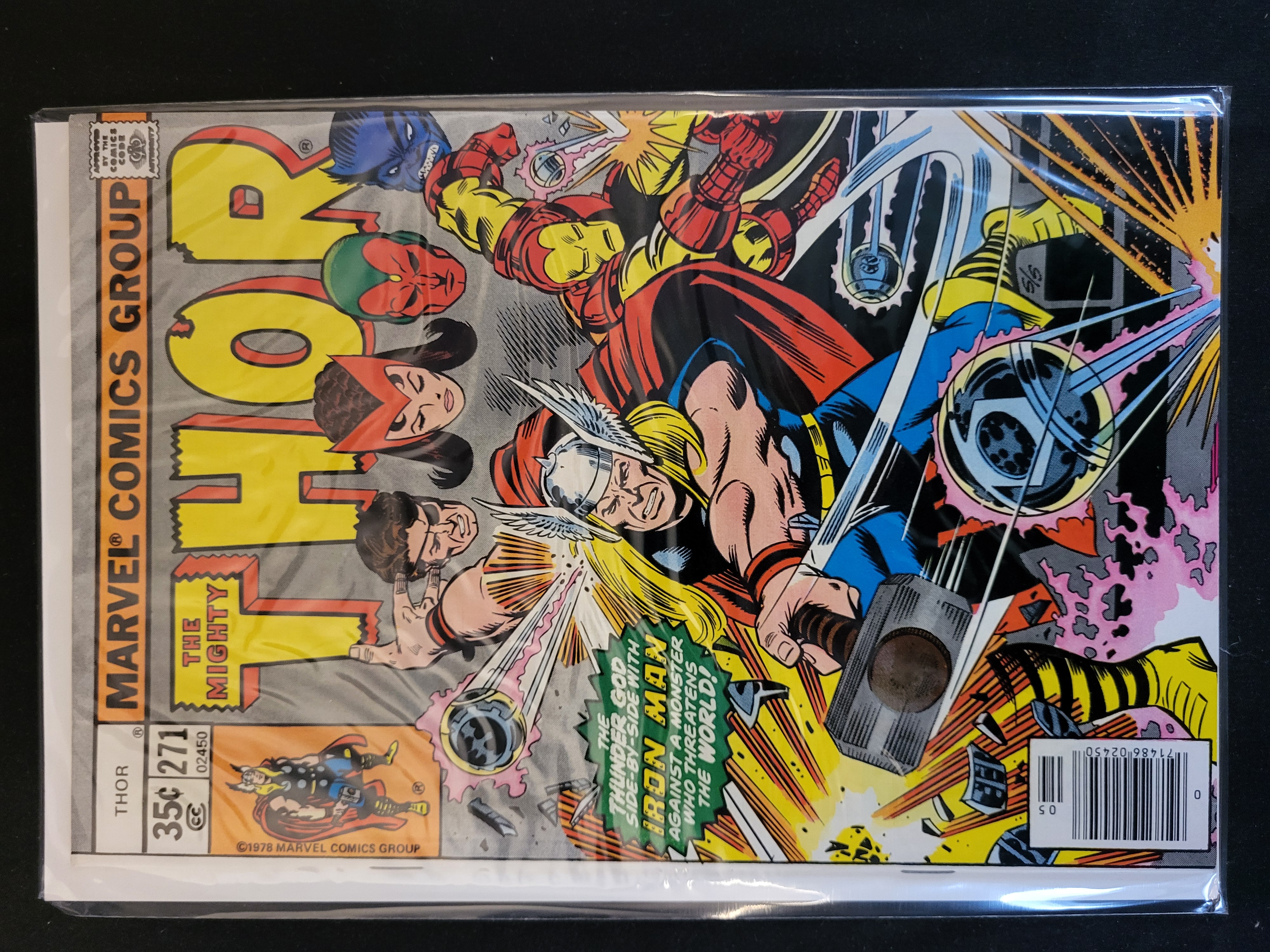 BID PER WHAT YOU SEE IN THE PHOTO, NOT THE AI GENERATED TITLES AND DESCRIPTIONS! A vintage American comic book titled The Mighty Thor, issue number 271, published by Marvel Comics Group in 1978. The cover features dynamic action illustrations of Thor and Iron Man, with a sidebar depicting members of the Avengers including Beast, Vision, Scarlet Witch, and Wonder Man. This issue features contributions by writer Len Wein. Identifying markings include a 35-cent price point, issue number 271, a UPC barcode, and a copyright date of 1978. The item is housed in a protective plastic sleeve with a backing board.