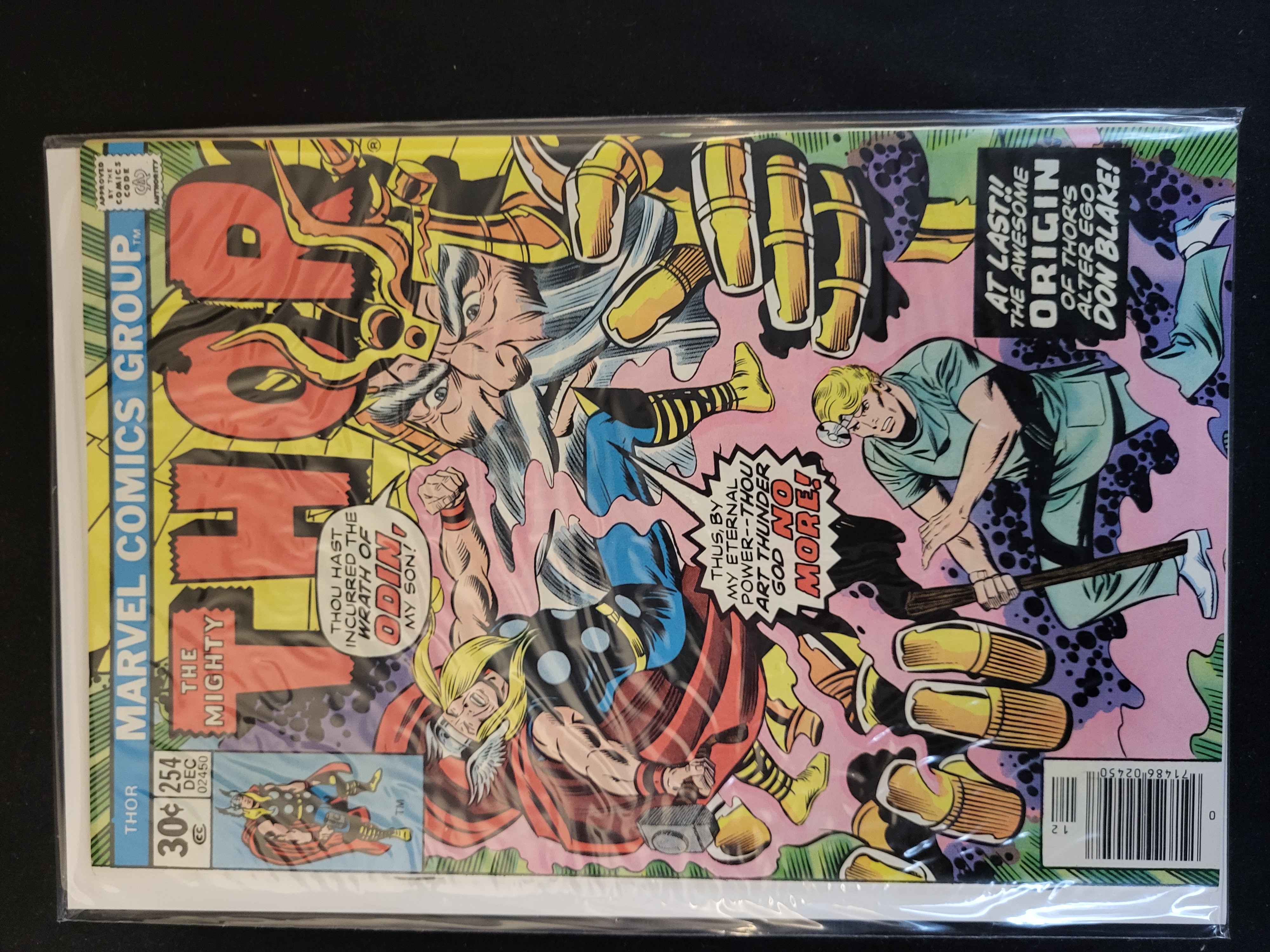 BID PER WHAT YOU SEE IN THE PHOTO, NOT THE AI GENERATED TITLES AND DESCRIPTIONS! This Bronze Age comic book is titled The Mighty Thor, issue number 254, published by the Marvel Comics Group with a cover date of December 1976. The cover features a 30-cent price point and a standard UPC barcode located in the lower right corner. The cover illustration depicts a confrontation between the characters Odin and Thor, accompanied by an inset text box titled The Awesome Origin of Thor’s Alter Ego Don Blake!. The item is presented in a clear protective plastic sleeve with a white backing board.