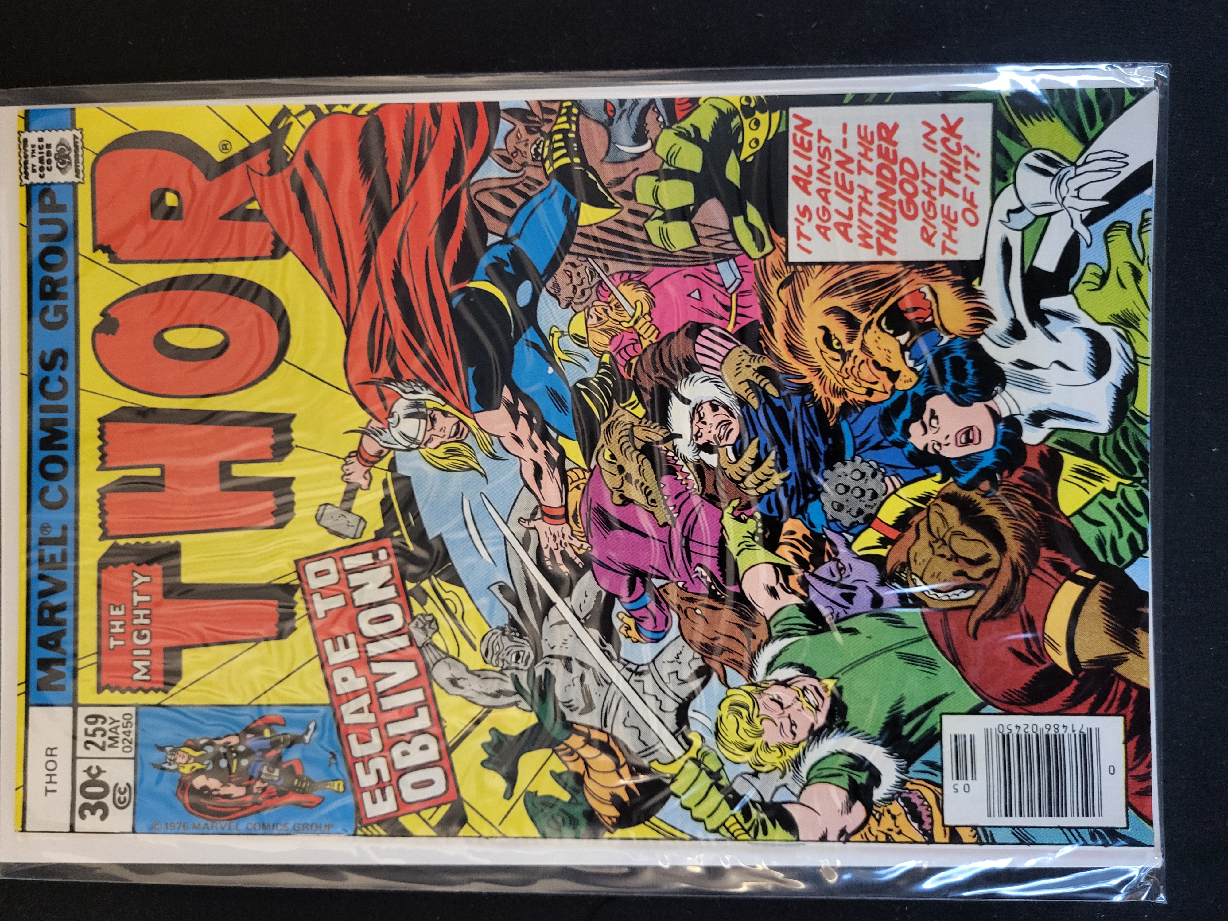 BID PER WHAT YOU SEE IN THE PHOTO, NOT THE AI GENERATED TITLES AND DESCRIPTIONS! This Marvel Comics Group publication is an issue of The Mighty Thor, number 259, dated May 1977. It is a Bronze Age comic book featuring a multi-colored cover with action artwork depicting Thor and several alien characters in combat. The cover includes the headlines Escape to Oblivion! and It’s Alien Against Alien– With the Thunder God Right in the Thick of It!. The front cover displays a 30-cent price, the Comics Code Authority seal, and a UPC barcode. The comic is printed on paper and is housed in a clear plastic protective sleeve with a cardboard backing board.
