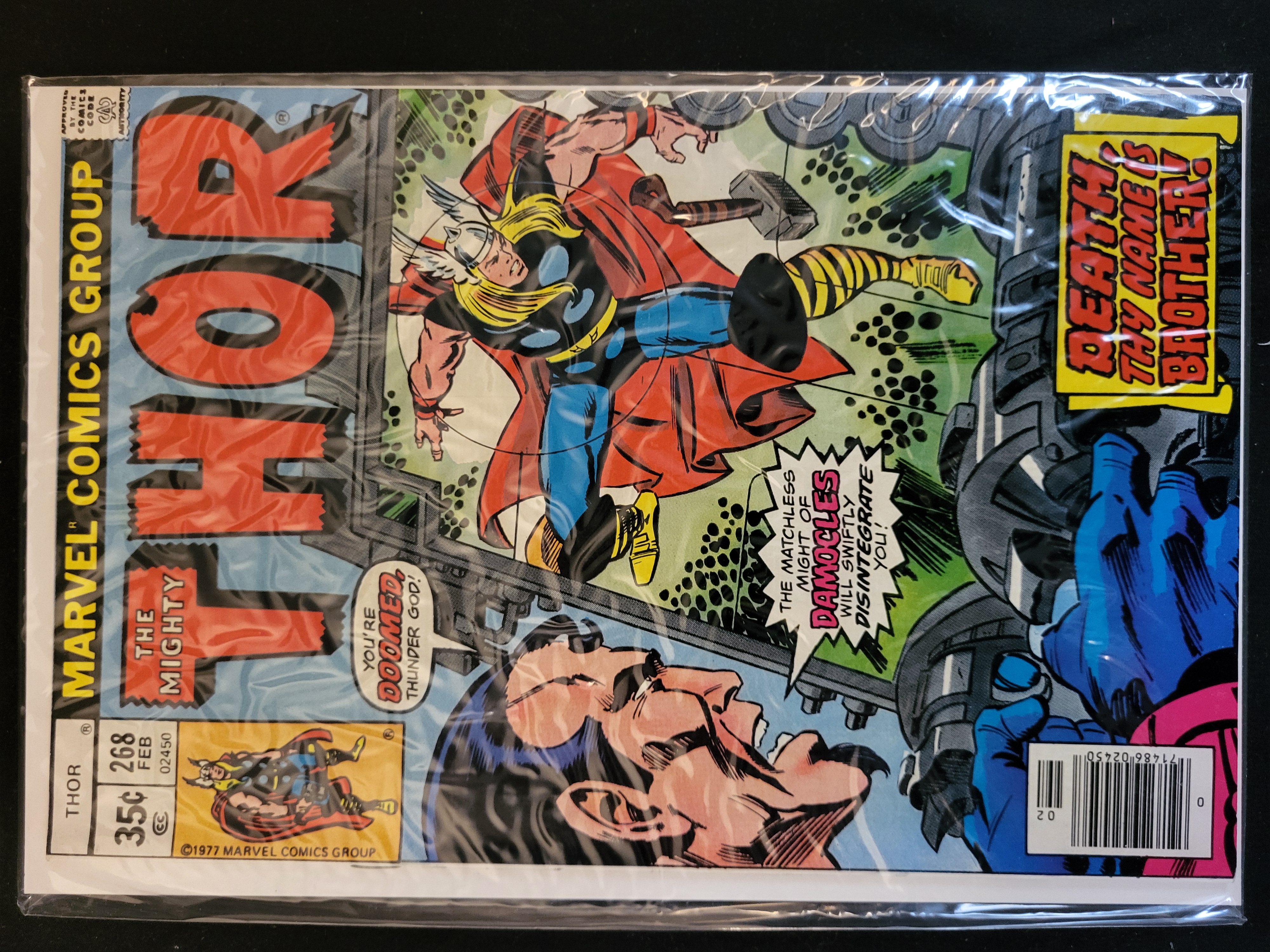 BID PER WHAT YOU SEE IN THE PHOTO, NOT THE AI GENERATED TITLES AND DESCRIPTIONS! A vintage comic book published by Marvel Comics Group, titled The Mighty Thor, issue number 268, dated February 1978. The cover features an illustration of Thor in combat with the headlines Death Thy Name Is Brother! and The Matchless Might of Damocles will swiftly disintegrate you!. The front cover includes a 35-cent original price, the Comics Code Authority seal of approval, and a UPC barcode in the lower right corner. The copyright notice at the bottom left is dated 1977. The item is housed in a protective clear plastic sleeve with a cardboard backing.