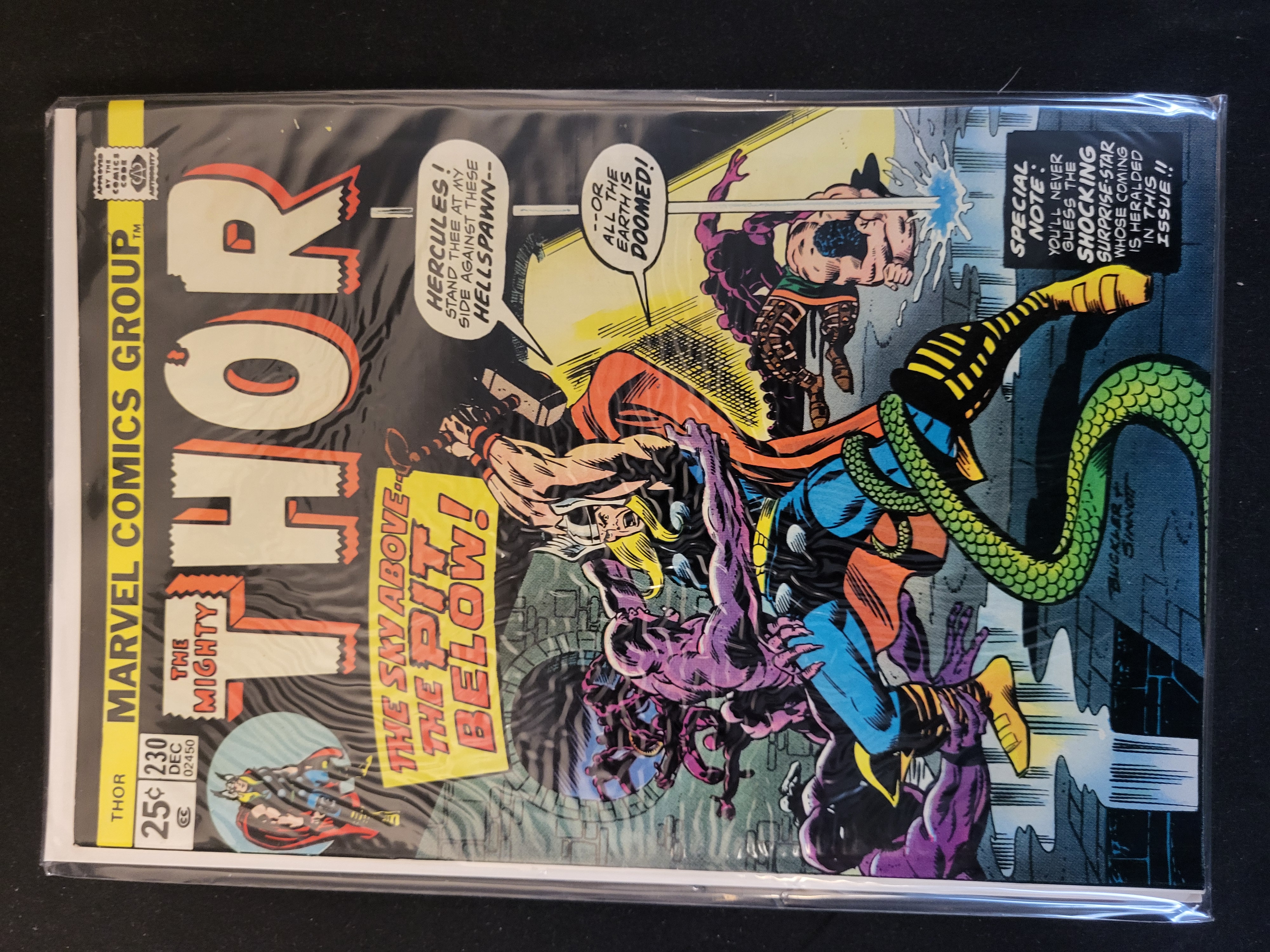 BID PER WHAT YOU SEE IN THE PHOTO, NOT THE AI GENERATED TITLES AND DESCRIPTIONS! The Mighty Thor issue number 230, published by Marvel Comics Group in December 1974. This Bronze Age comic book features cover art by Rich Buckler and Joe Sinnott, illustrating Thor and Hercules in combat against monsters and a serpent under the title The Sky Above… The Pit Below!. The front cover displays the standard Marvel Comics Group masthead, a 25-cent price, and the Comics Code Authority seal. The comic is presented in a clear plastic protective sleeve.
