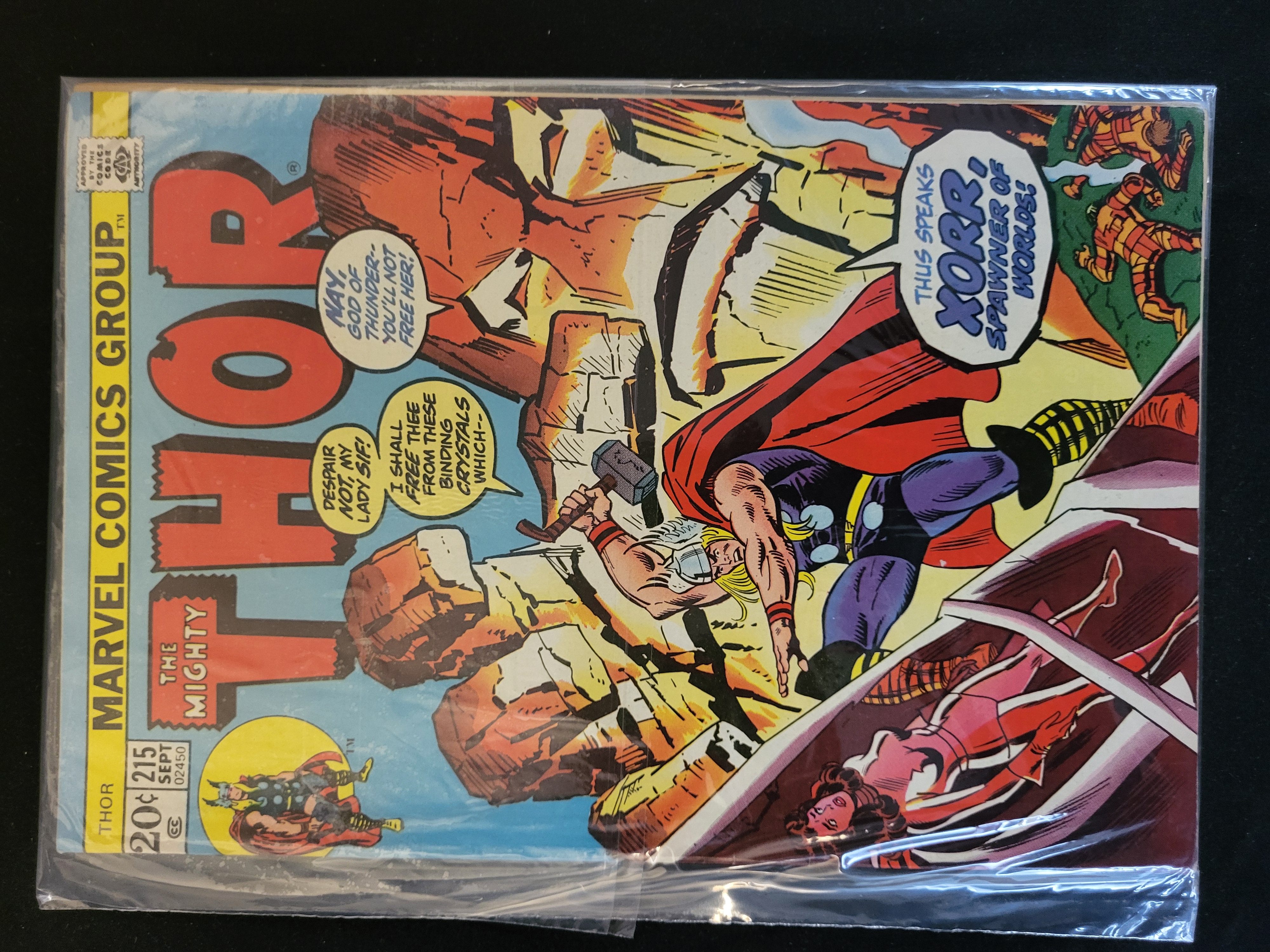 BID PER WHAT YOU SEE IN THE PHOTO, NOT THE AI GENERATED TITLES AND DESCRIPTIONS! A vintage Marvel Comics Group publication of The Mighty Thor, issue number 215, dated September 1973. This issue features the origin of Xorr the God, identified on the cover as Xorr, Spawner of Worlds. The cover art depicts Thor wielding Mjolnir against the rocky adversary, with Lady Sif appearing in the lower right foreground. The publication displays the original 20-cent cover price and the Comics Code Authority seal in the upper left corner.
