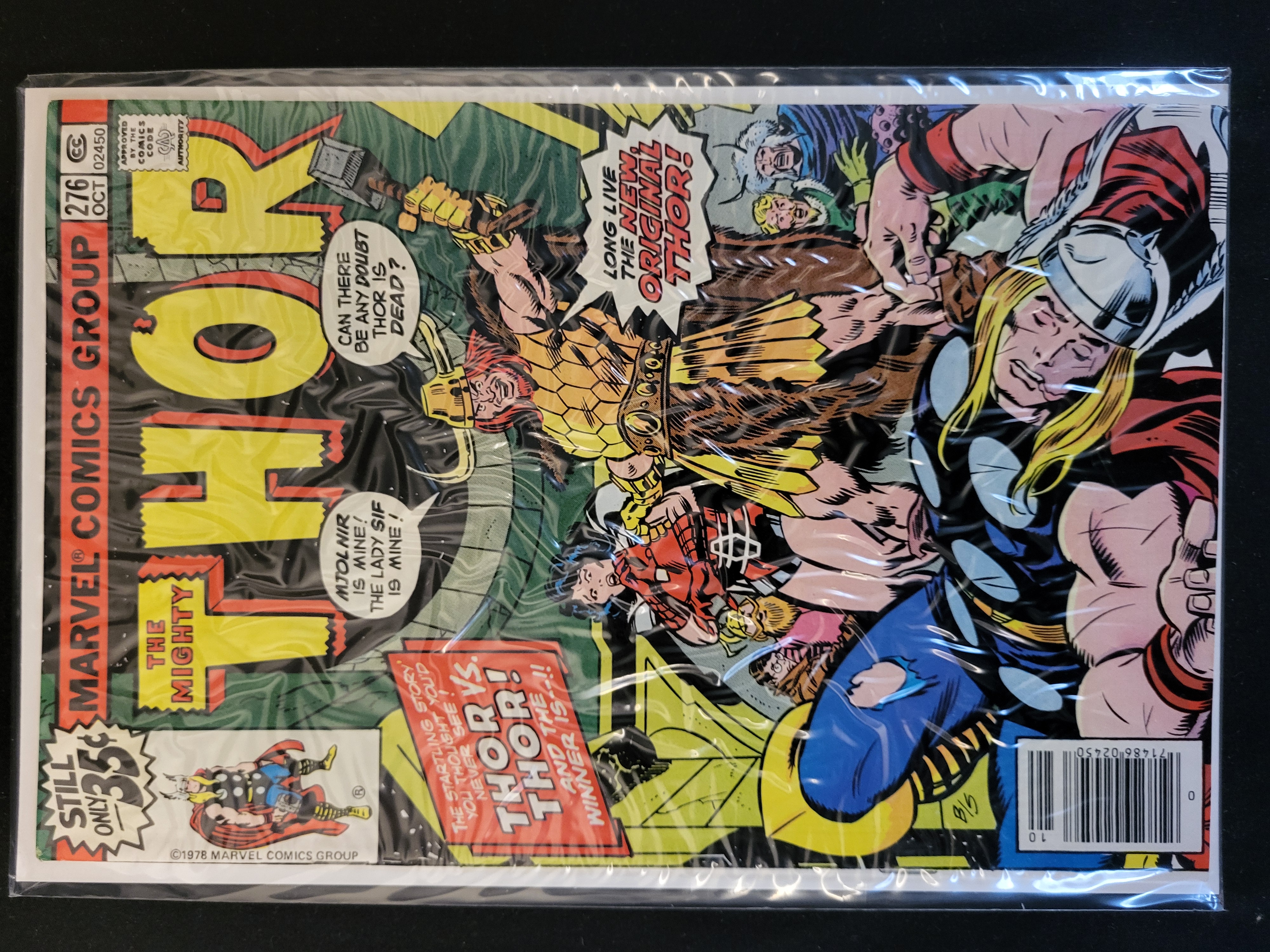 BID PER WHAT YOU SEE IN THE PHOTO, NOT THE AI GENERATED TITLES AND DESCRIPTIONS! This is a Bronze Age comic book titled The Mighty Thor issue number 276, published by Marvel Comics Group with a cover date of October 1978. The cover art depicts a confrontation between Thor and a figure designated as the New Original Thor. The front cover includes a 35-cent price point, the official Comics Code Authority seal, and various dialogue bubbles. A UPC barcode is located in the lower right corner. The publication is housed in a clear protective plastic sleeve with a white backing board.