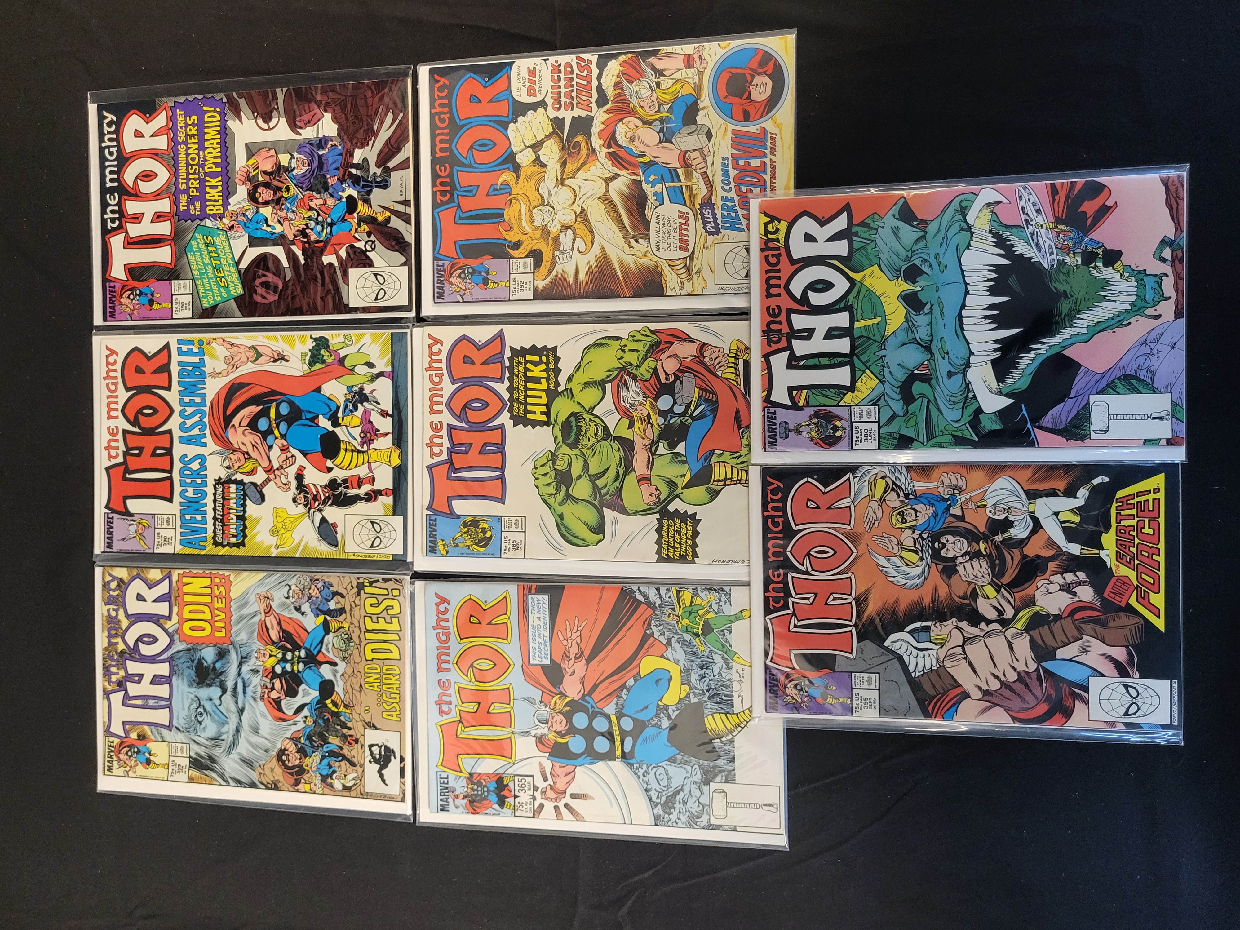 BID PER WHAT YOU SEE IN THE PHOTO, NOT THE AI GENERATED TITLES AND DESCRIPTIONS! A collection of Marvel Comics The Mighty Thor comic books, primarily dating from the mid to late 1980s. This group includes several issues from the run by writer and artist Walter Simonson. Visible issue numbers include 334, 339, 352, 365, 380, 385, 390, and 395. The cover illustrations feature Thor with various Marvel characters including the Hulk, Daredevil, and the Avengers. Issue 339 is noted in market literature for the first appearance of Stormbreaker. Each comic is individually housed in a protective plastic sleeve with a cardboard backing board.