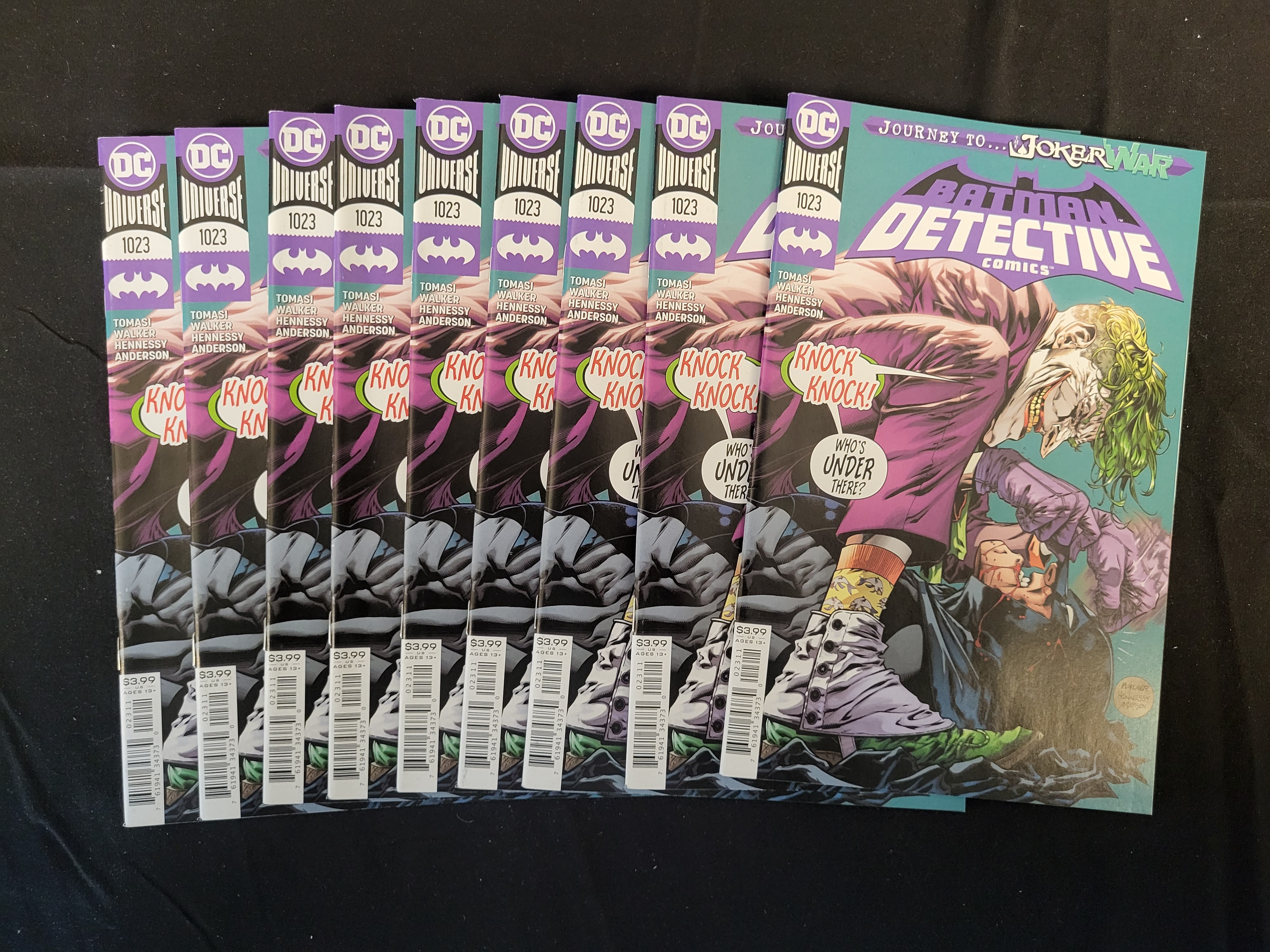 BID PER WHAT YOU SEE IN THE PHOTO, NOT THE AI GENERATED TITLES AND DESCRIPTIONS! A collection of Detective Comics issue #1023, published by DC Comics in 2020. These issues feature the Journey to Joker War banner and storyline. The cover art, by the creative team of Tomasi, Walker, Hennessy, and Anderson, depicts a confrontation between the Joker and Batman with a Knock Knock word bubble. Each copy is a modern-age comic book with a printed retail price of $3.99 and a rating for ages 13+. The books are staple-bound with full-color illustrations.