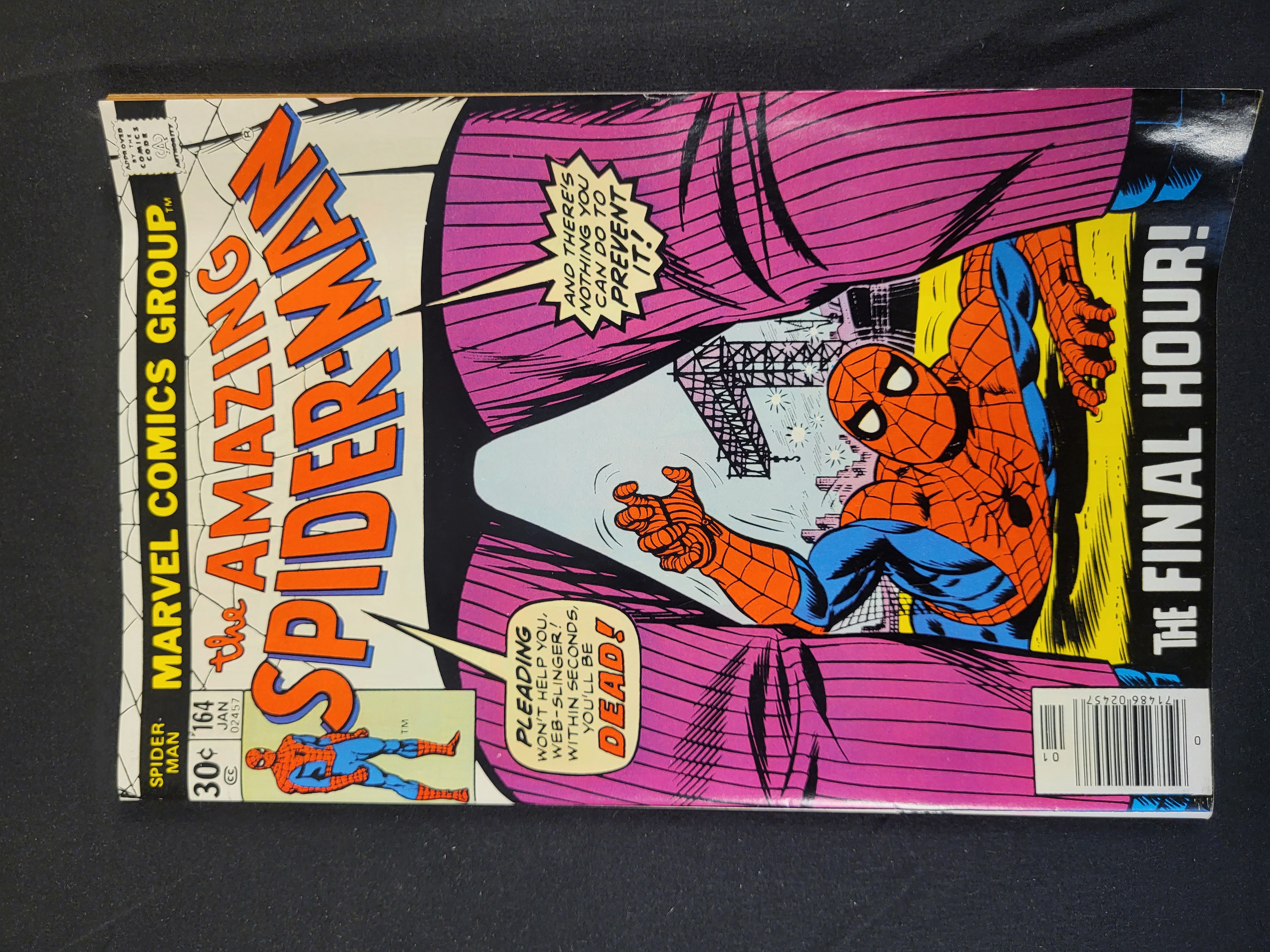 BID PER WHAT YOU SEE IN THE PHOTO, NOT THE AI GENERATED TITLES AND DESCRIPTIONS! The Amazing Spider-Man issue no. 164 is a vintage comic book published by Marvel Comics Group with a cover date of January 1977. The cover features a color illustration of Spider-Man framed by the legs of the Kingpin, accompanied by the caption The Final Hour! and dialogue bubbles. The front cover includes the 30-cent price, the Comics Code Authority seal, and a newsstand barcode. This issue features an appearance by the Kingpin. The item is constructed of printed paper with a stapled spine.