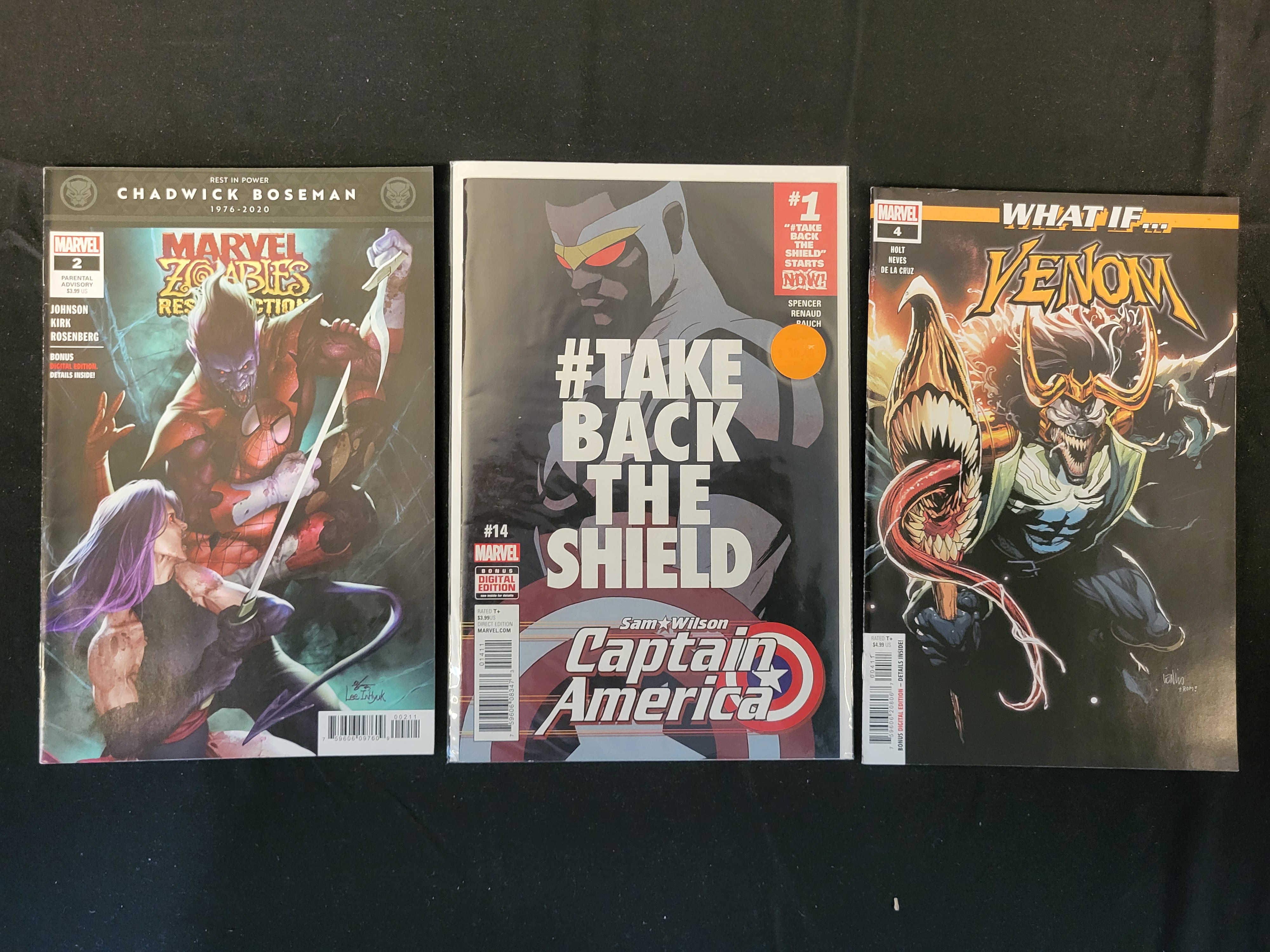 BID PER WHAT YOU SEE IN THE PHOTO, NOT THE AI GENERATED TITLES AND DESCRIPTIONS! A collection of three modern Marvel comic books featuring Captain America: Sam Wilson #14, Marvel Zombies Resurrection #2, and What If… Venom #4. The Captain America: Sam Wilson #14 (2016) issue features the #TAKE BACK THE SHIELD tagline on the cover with creative credits to Spencer, Renaud, and Rauch. Marvel Zombies Resurrection #2 includes a Rest in Power Chadwick Boseman 1976-2020 memorial banner with cover art by In-Hyuk Lee and credits to Johnson, Kirk, and Rosenberg. What If… Venom #4 depicts a Venomized Loki with creative credits to Holt, Neves, and De La Cruz. Each issue is a standard format comic book with full-color printed covers and staple-bound construction.