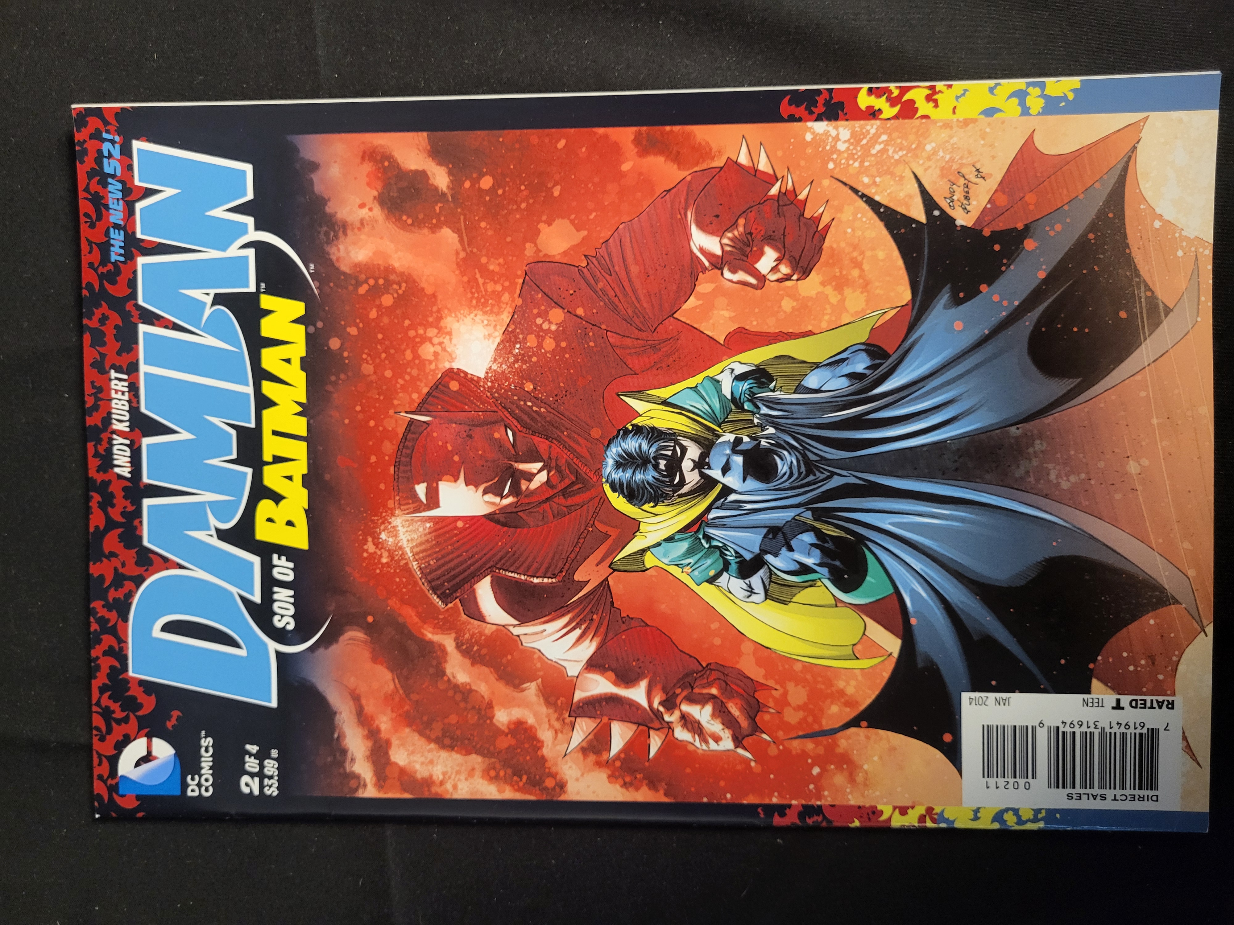 BID PER WHAT YOU SEE IN THE PHOTO, NOT THE AI GENERATED TITLES AND DESCRIPTIONS! This comic book is issue number two of a four-part limited series titled Damian: Son of Batman, published by DC Comics as part of The New 52! line. The item is a standard format comic book printed on paper with a staple-bound spine. The cover features artwork and a signature by Andy Kubert, depicting Damian Wayne in a costume blending elements of Robin and Batman against a large, stylized red image of Batman. Publication details include a cover price of $3.99, a January 2014 date, and a Rated T for Teen designation. A standard barcode for direct sales is present in the lower-right corner.